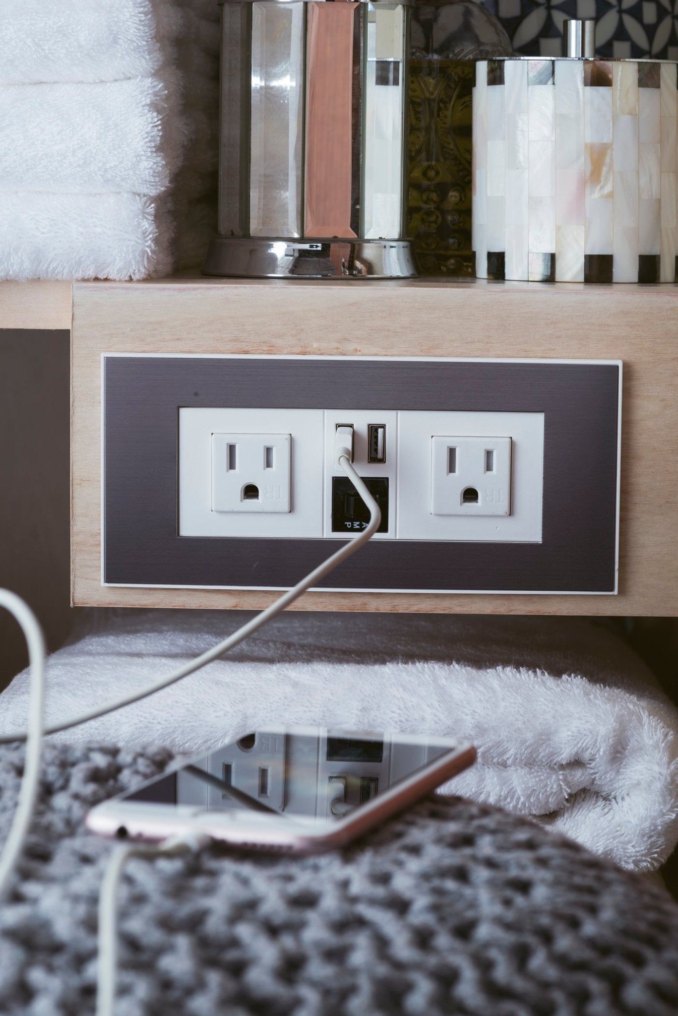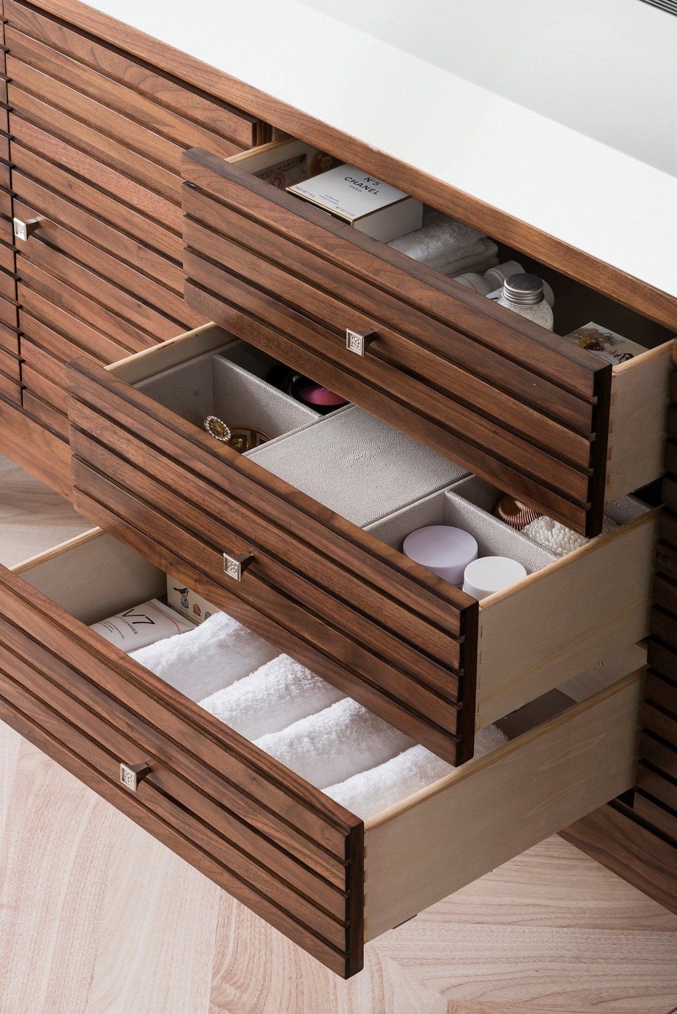 The Linear 72" Mid-Century Walnut Single Vanity features spacious storage options with four doors, two shelves, and three drawers. Cabinet exterior is made from solid American Walnut, highlighted by clean lines and Satin Nickel finish knobs. Premium features include one faux shagreen drawer organizer and one 120 Volt UL Rated electrical component with two electrical and two USB outlets. The look is completed with a Glossy White Composite Stone integrated top and sink. The recessed interior drawer is designed to only extend and open half way.
