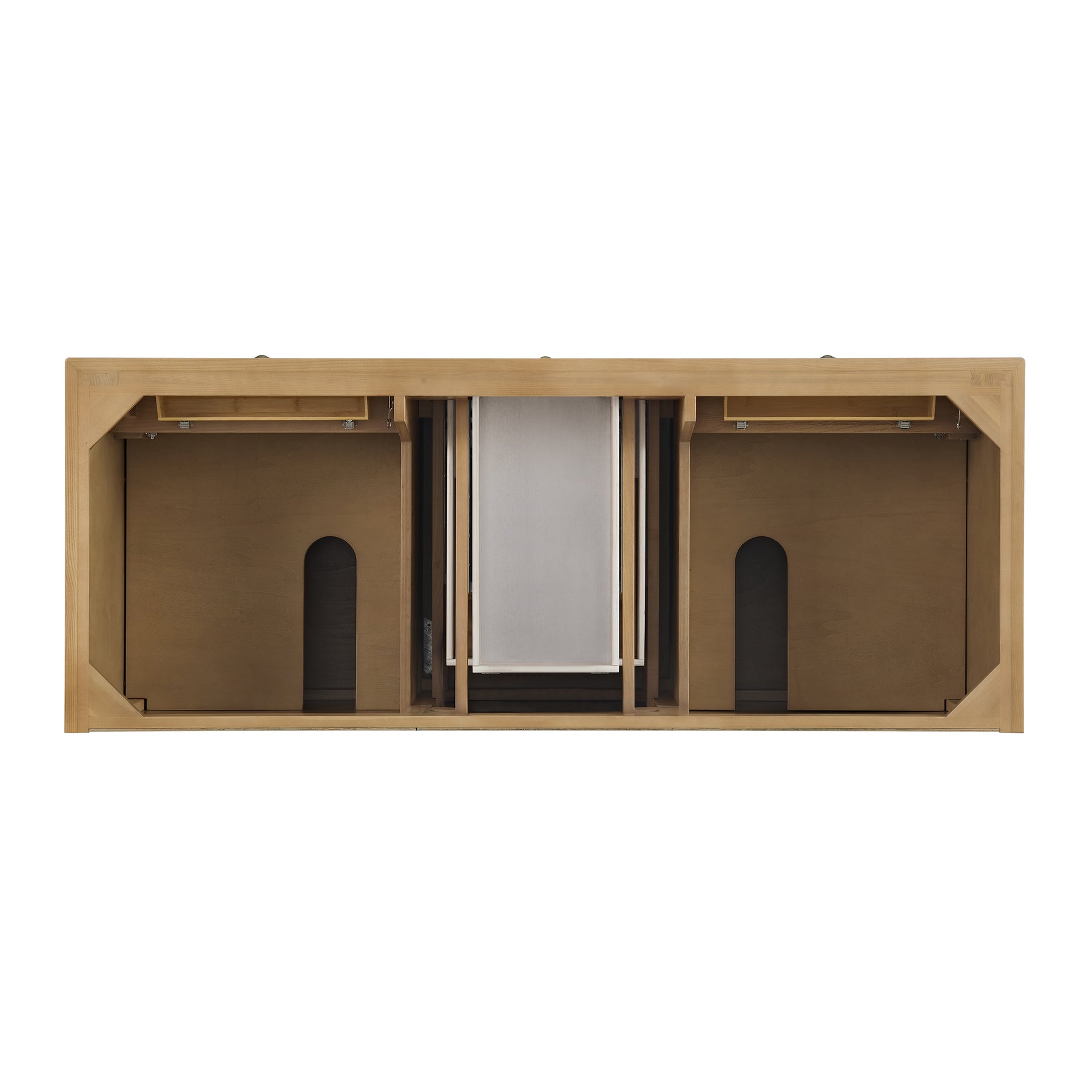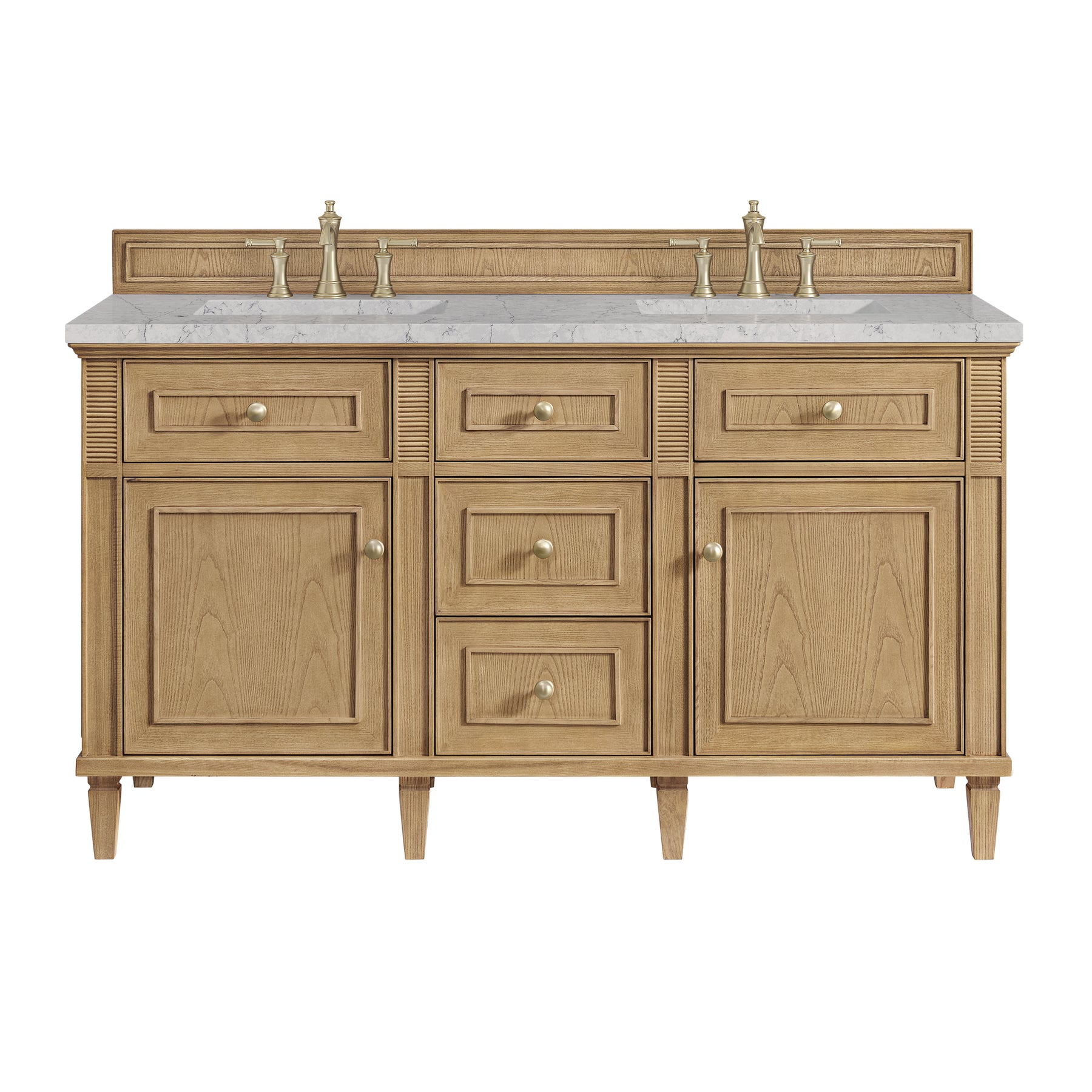 The Lorelai 60" Double Vanity by James Martin Vanities celebrates timeless design and exquisite finish details, combined with practical function. The Light Natural Oak finish is accented by coin-edge knobs in Champagne Brass which provides a sophisticated contrast. Reeded details and raised picture frame molding lend visual interest. The two-door cabinet opens to reveal a spacious interior with single shelves and a convenient USB/120V power outlet behind each door. Three standard full-extension drawers and two top-row tip-out drawers offer additional storage. The addition of a beautiful Eternal Jasmine Pearl Silestone top with undermount sink completes the look.