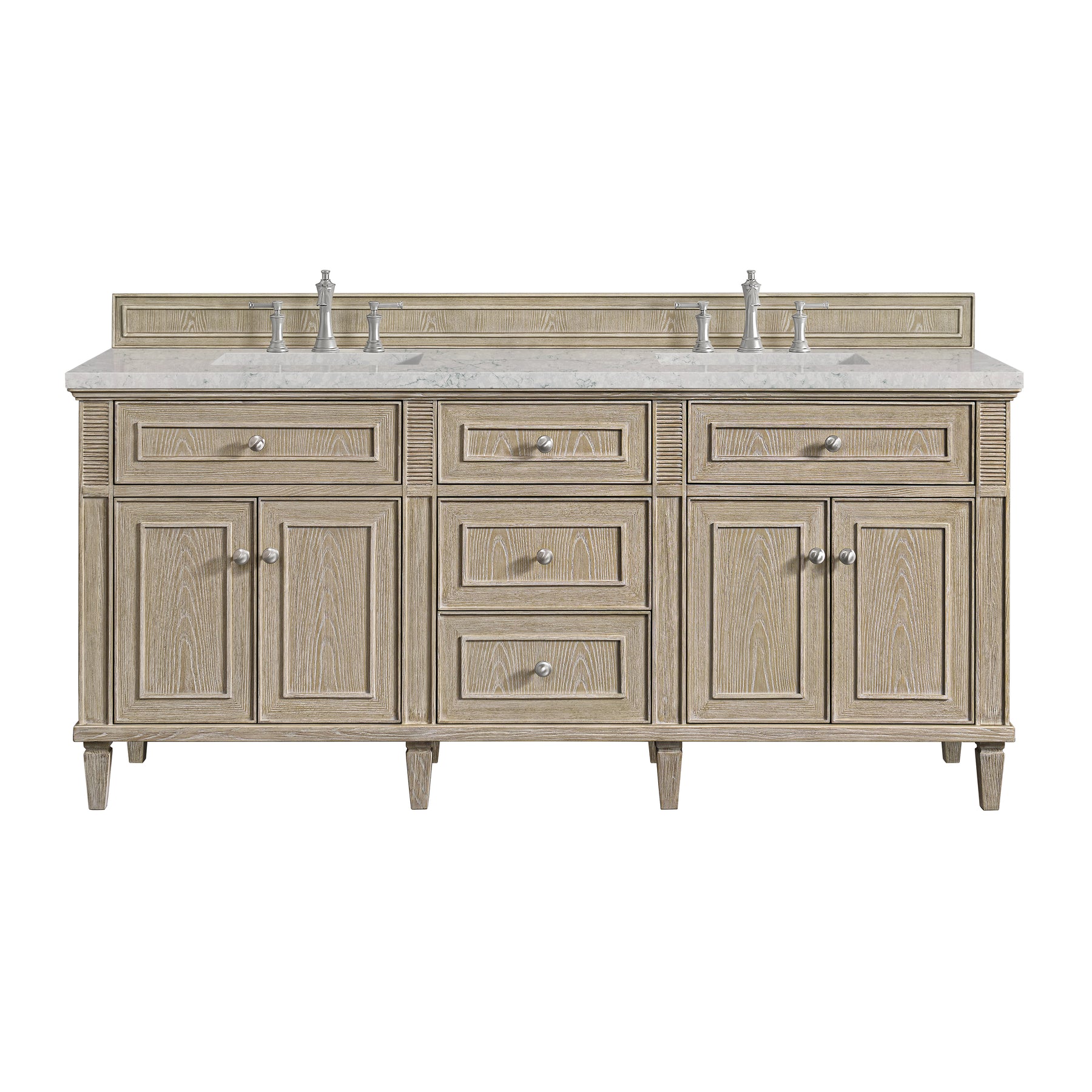 The 72” Lorelai Double Vanity celebrates timeless form and exquisite finish details, combined with practical function. The Whitewashed Oak finish is accented by reeded details, and clean, raised picture frame molding. Coin-edge knobs in Satin Nickel provide the perfect accent. This four-door cabinet opens to spacious interior with shelves and convenient USB/Electric power outlets. Three traditional drawers and two tip-outs offer additional storage space. Completing the look is the Eternal Jasmine Pearl Silestone top by Cosentino, featuring an elegant white background with subtle marbleized swirls and dark Bleu-gray veining patterns.