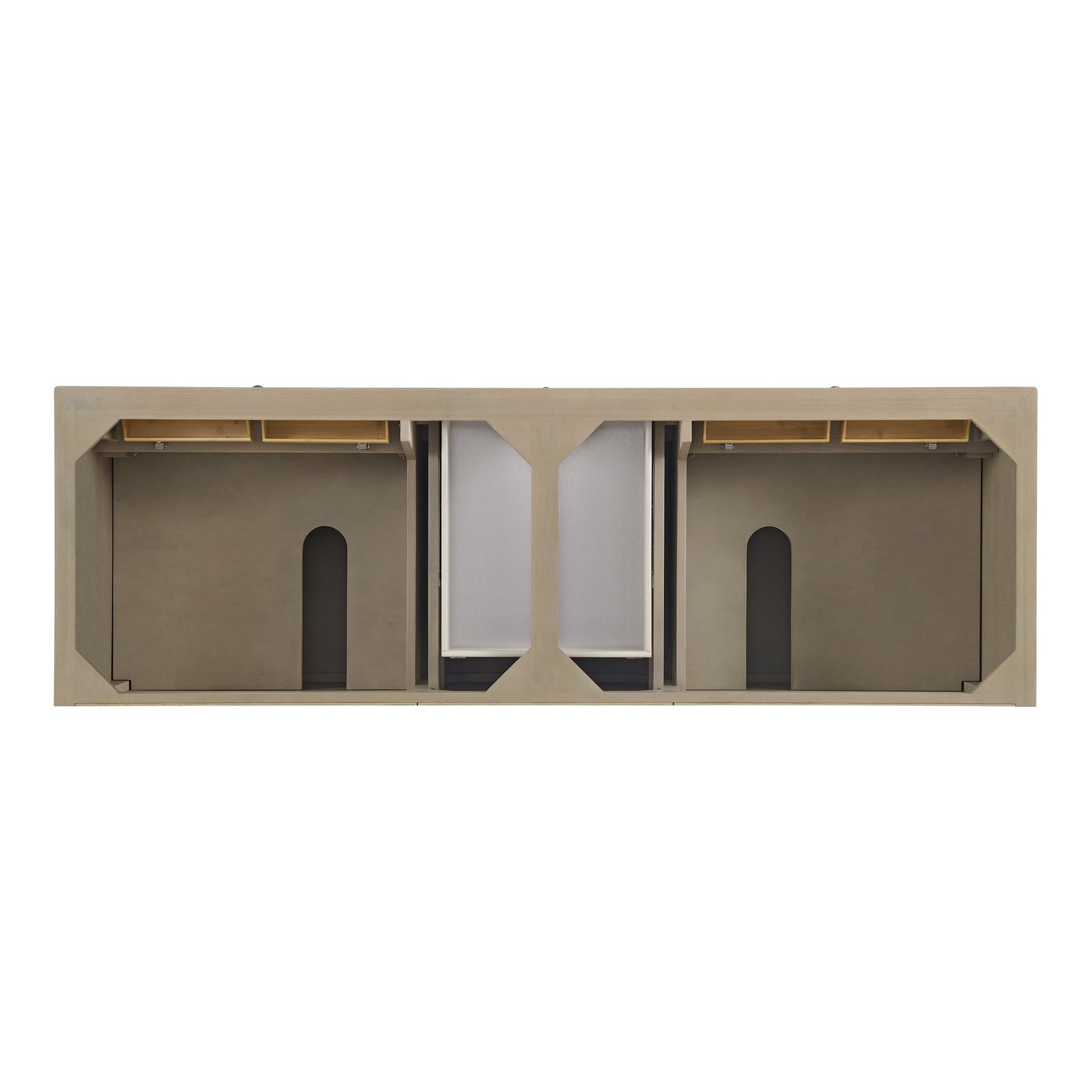 The 72” Lorelai Double Vanity celebrates timeless form and exquisite finish details, combined with practical function. The Whitewashed Oak finish is accented by reeded details, and clean, raised picture frame molding. Coin-edge knobs in Satin Nickel provide the perfect accent. This four-door cabinet opens to spacious interior with shelves and convenient USB/Electric power outlets. Three traditional drawers and two tip-outs offer additional storage space. The Lime Delight Silestone top lends warm, textured beige tones to perfectly complement the finish on the vanity.
