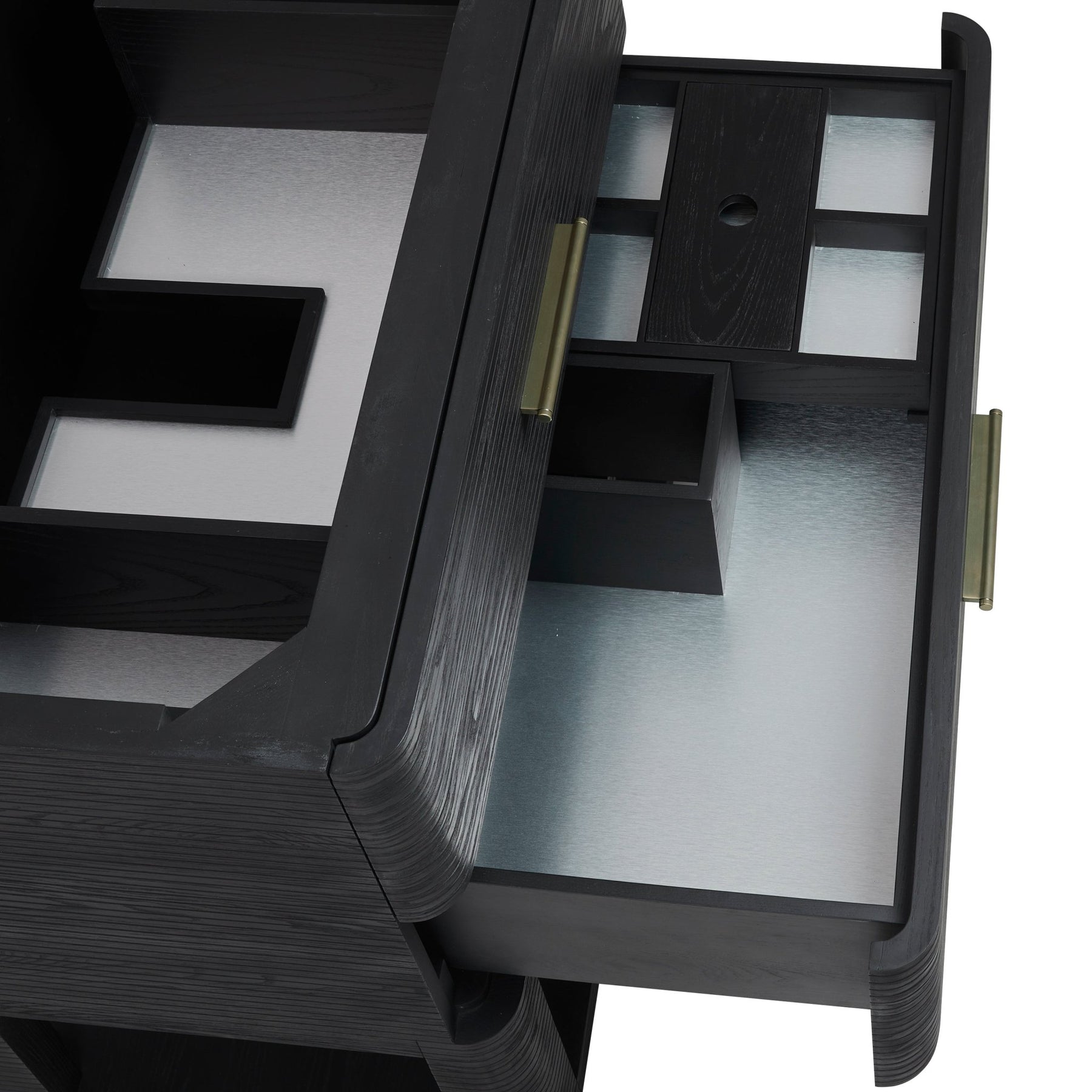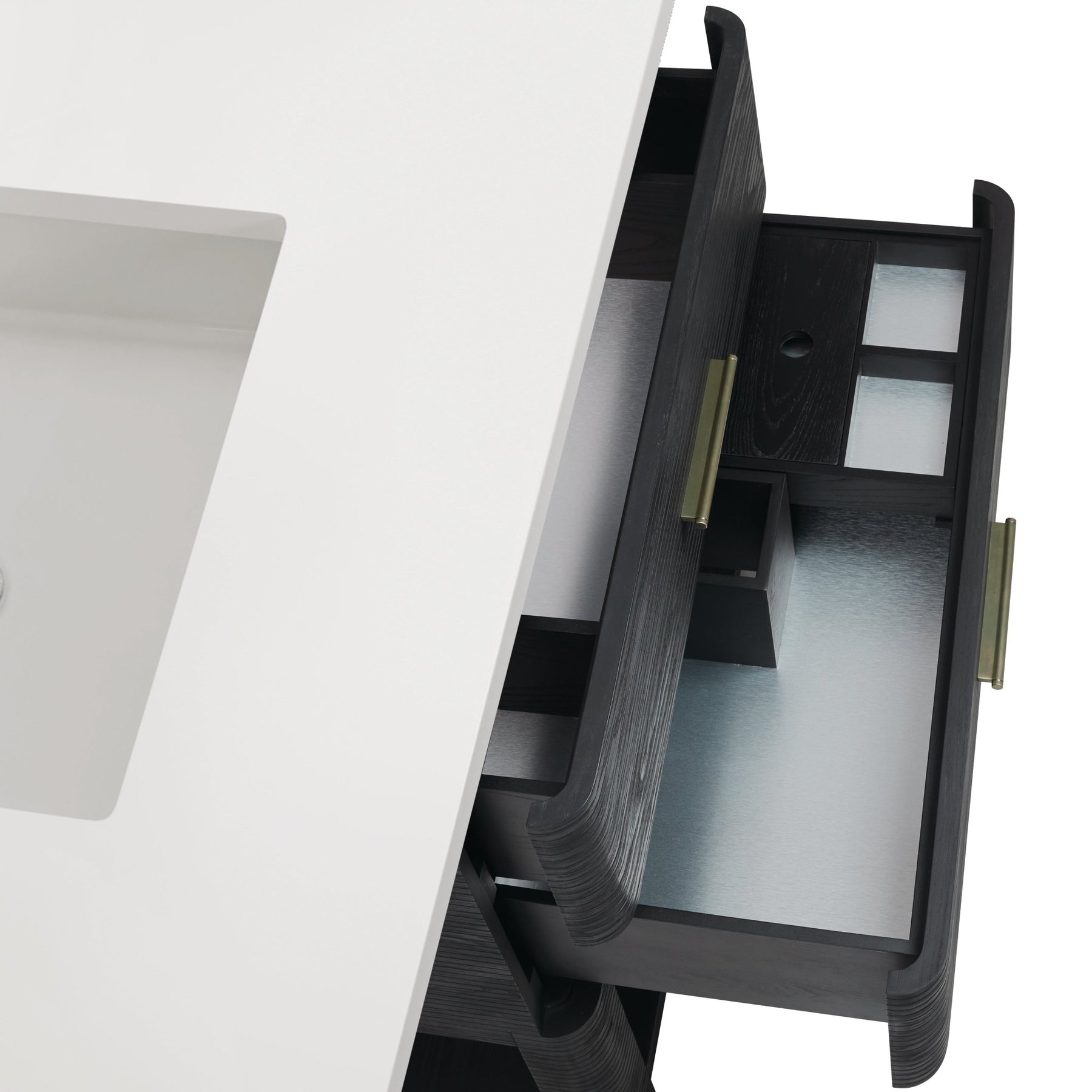 The Lucian 36” single vanity is a visual delight, boasting a rich Carbon Oak finish that adds warmth and character to your space. Complemented by Champagne Brass hardware, the ribbed detailing is meticulously crafted. Enjoy ample storage with two drawers and a lower exposed shelf that provides versatility to your storage solutions. With the addition of an elegant Victorian Silver Silestone top and undermount porcelain sink, this vanity is a seamless integration of modern design and functionality.