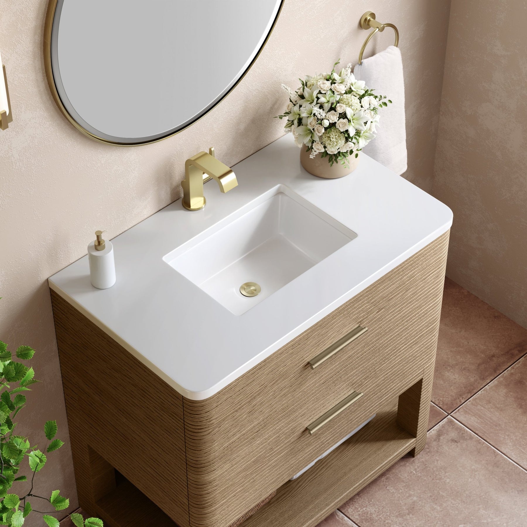 The Lucian 36” single vanity is a visual delight, boasting a rich Pebble Oak finish that adds warmth and character to your space. Complemented by Champagne Brass hardware, the ribbed detailing is meticulously crafted. Enjoy ample storage with two drawers and a lower exposed shelf that provides versatility to your storage solutions. With the addition of a classic White Zeus Silestone top and undermount porcelain sink, this vanity is a seamless integration of modern design and functionality.