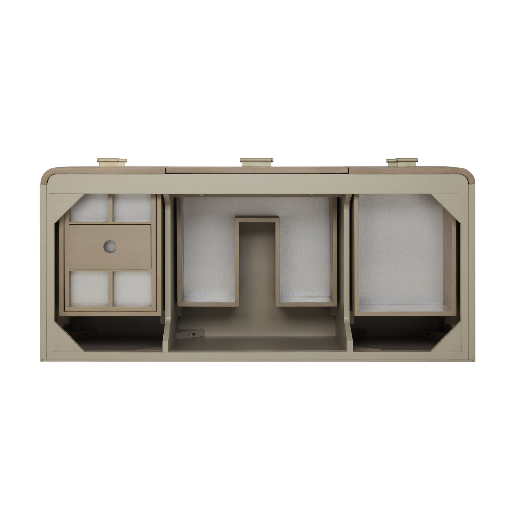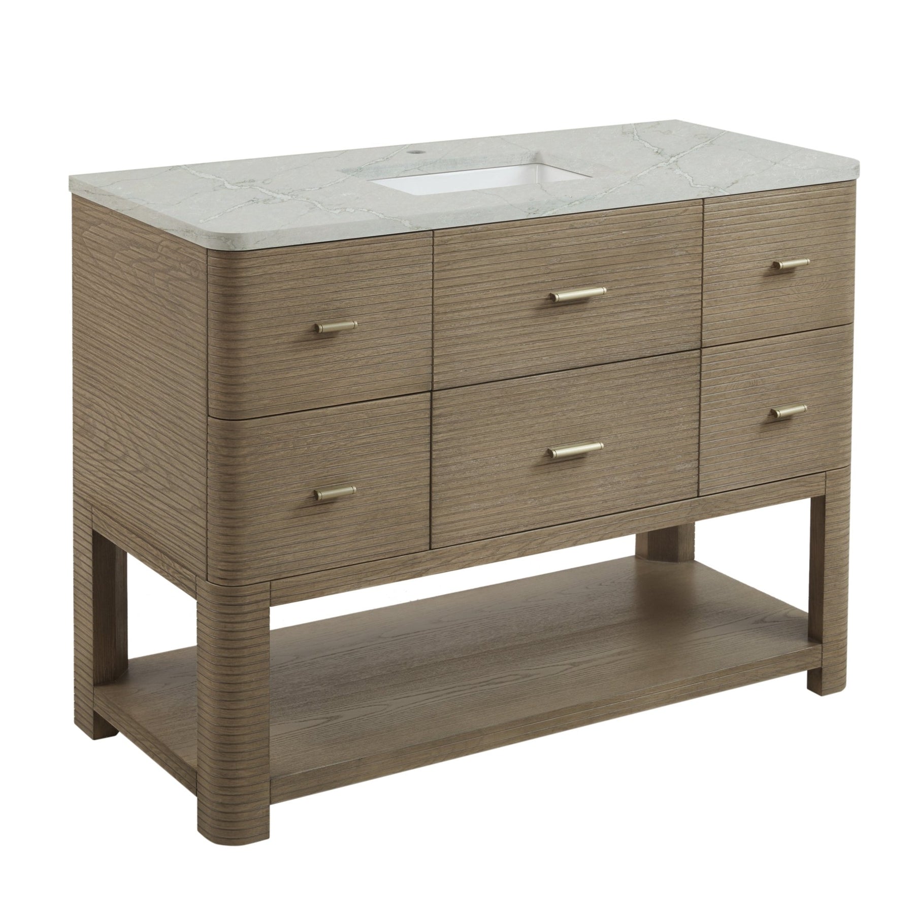 The Lucian 48” single vanity is a visual delight, boasting a rich Pebble Oak finish that adds warmth and character to your space. Complemented by Champagne Brass hardware, the ribbed detailing is meticulously crafted. Enjoy ample storage with one tip-out drawer and five traditional drawers, while a lower exposed shelf adds versatility to your storage solutions. With the addition of an elegant Victorian Silver Silestone top and undermount porcelain sink, this vanity is a seamless integration of modern design and functionality.