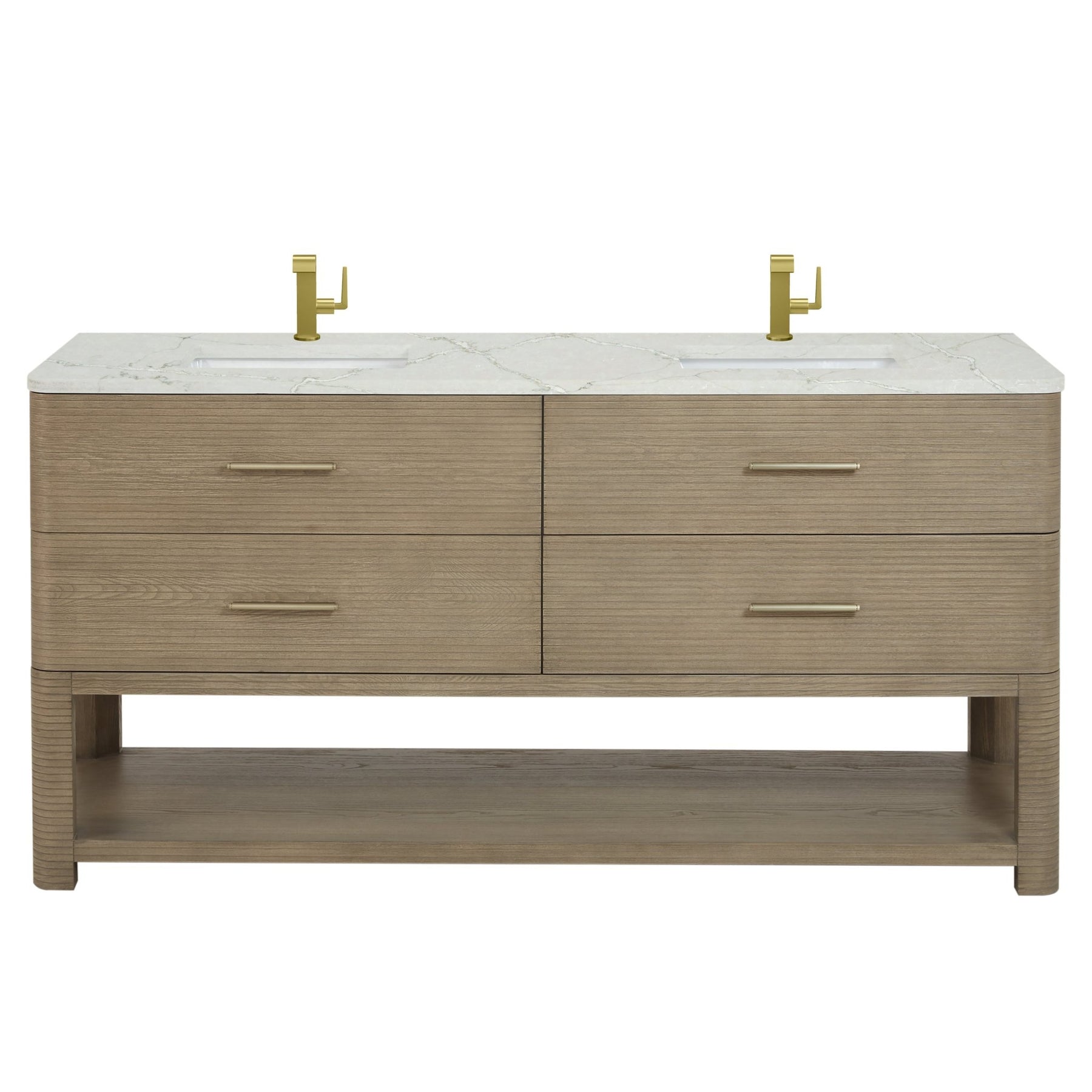 The Lucian 72” double vanity is a visual delight, boasting a rich Pebble Oak finish that adds warmth and character to your space. Complemented by Champagne Brass hardware, the ribbed detailing is meticulously crafted. Enjoy ample storage with four deep drawers and a lower shelf for added versatility. With the addition of an elegant Victorian Silver Silestone top and undermount porcelain sink, this vanity is a seamless integration of modern design and functionality.