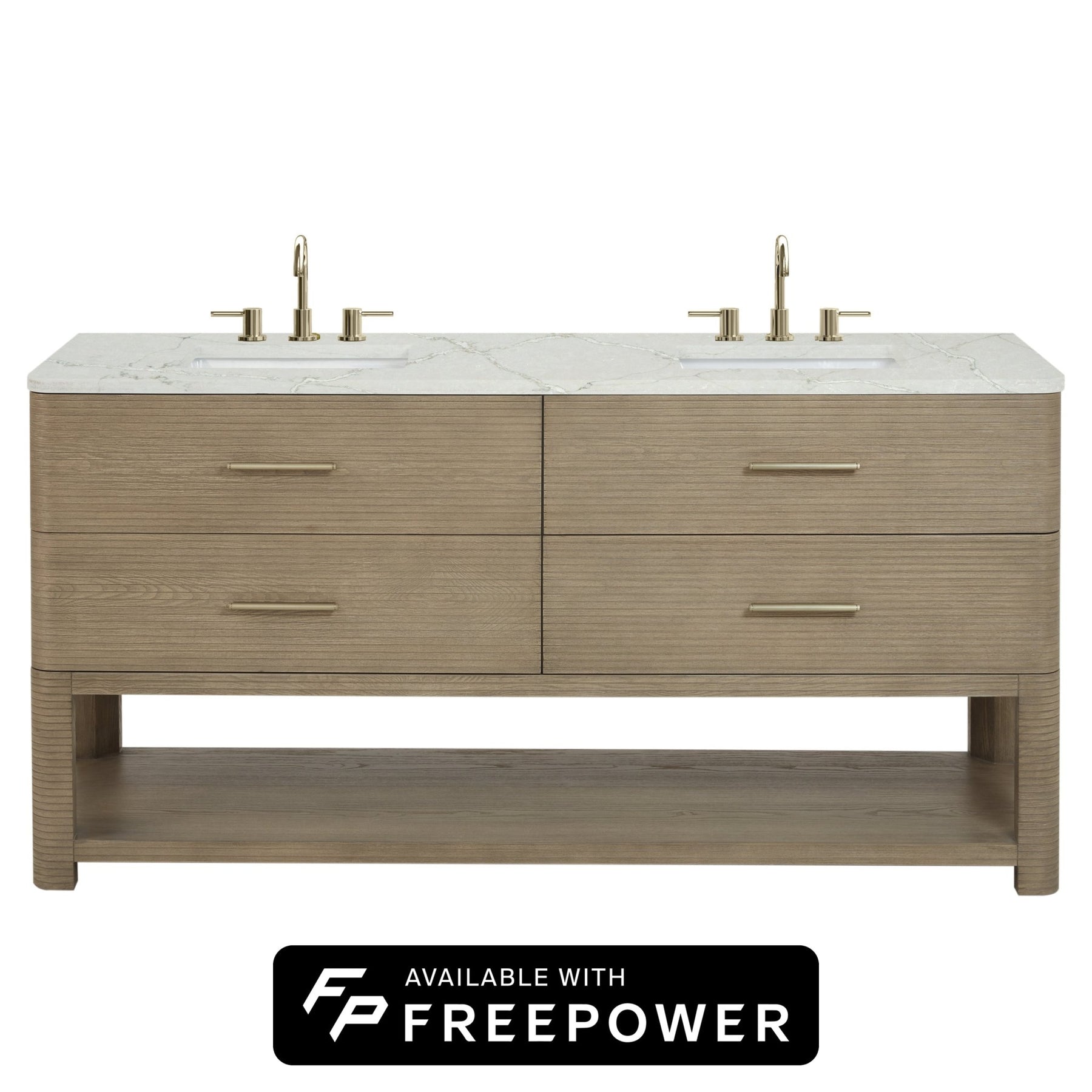 This unit is enabled with FreePower wireless charging; featuring a two-device charger seamlessly embedded into the countertop, indicated by a light-up halo in between the sinks. Designed for modern living, FreePower offers convenient, integrated, wireless charging when and where you need it.
