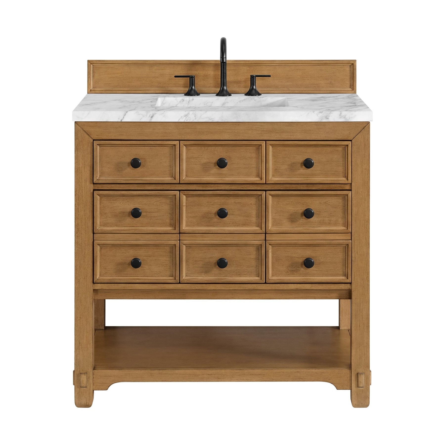 The Malibu 36" Single Vanity by James Martin Vanities features a warm Amber Birch finish and contemporary Matte Black hardware. Made from solid poplar with birch veneers, this vanity features three double-height drawers, one top-row tip-out drawer, and a bottom shelf for additional storage. A matching decorative wooden backsplash is included. The look is completed with a 3cm eased-edge Carrara Marble top with 8" widespread faucet holes.