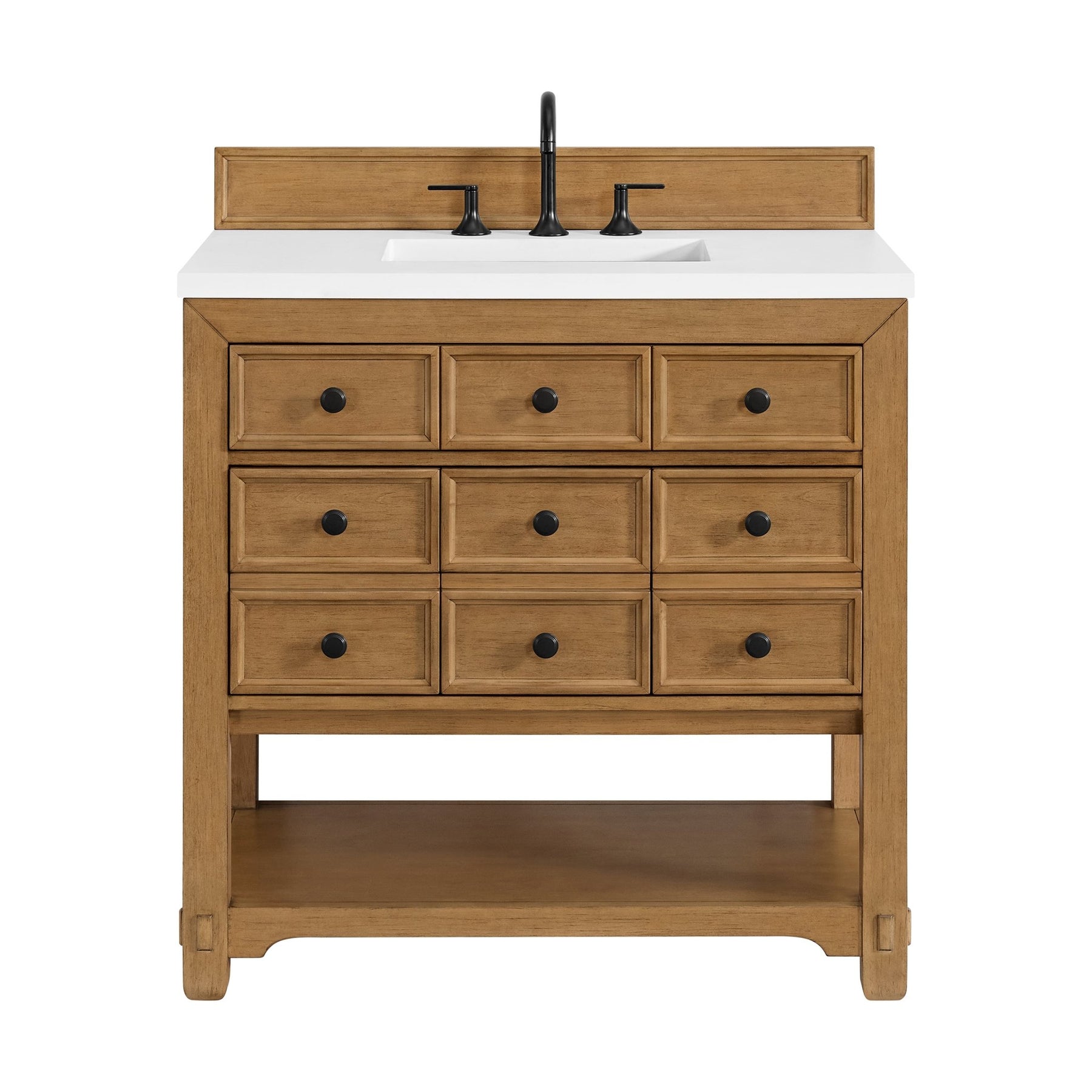 The Malibu 36" Single Vanity by James Martin Vanities features a warm Amber Birch finish and contemporary Matte Black hardware. Made from solid poplar with birch veneers, this vanity features three double-height drawers, one top-row tip-out drawer, and a bottom shelf for additional storage. A matching decorative wooden backsplash is included. The look is completed with a 3cm eased-edge White Zeus Silestone top with 8" widespread faucet holes.