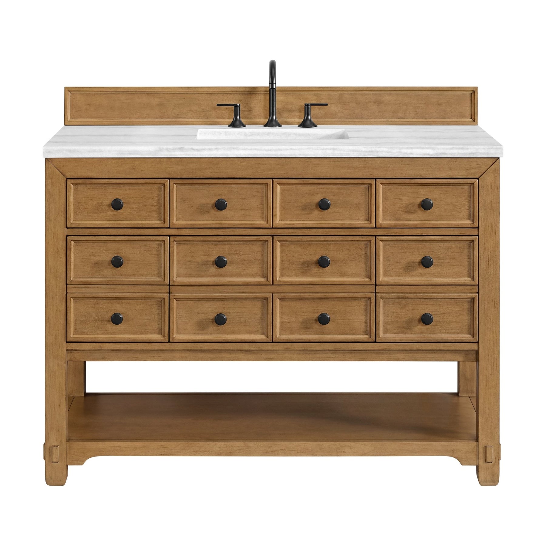 The Malibu 48" Single Vanity by James Martin Vanities features a warm Amber Birch finish and contemporary Matte Black hardware. Made from solid poplar with birch veneers, this vanity features five drawers (three are double-height), one top-row tip-out drawer, and a bottom shelf for additional storage. A matching decorative wooden backsplash is included. The look is completed with a 3cm eased-edge Arctic Fall Solid Surface top with 8" widespread faucet holes.