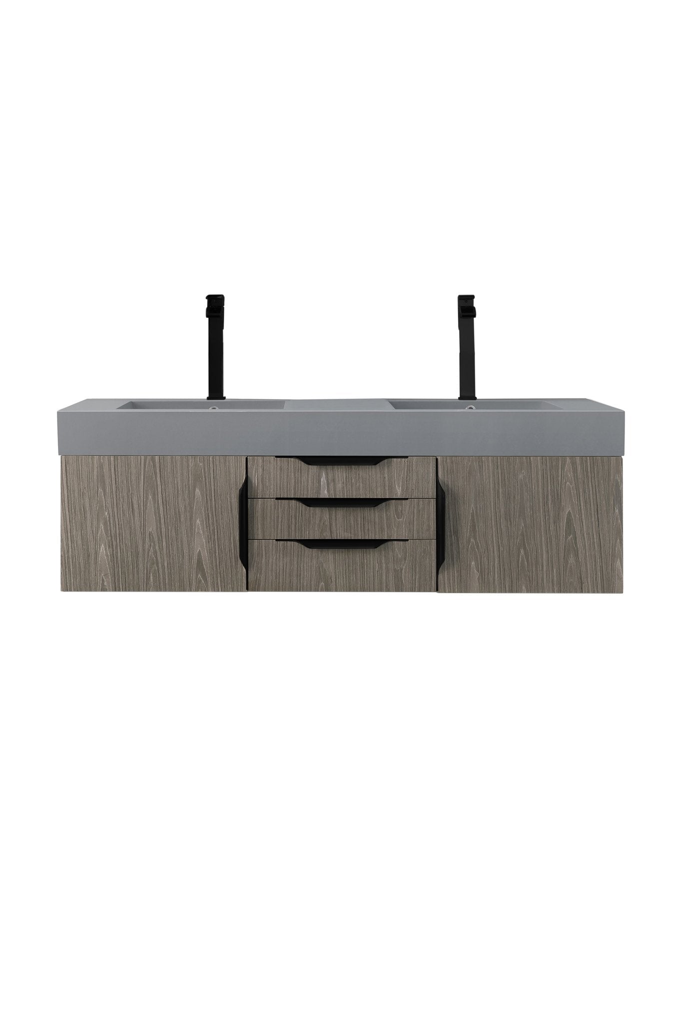 The Mercer Island 59" Ash Gray Double Vanity offers maximum storage with two soft-closing doors, three soft-closing drawers, and lower shelf space. This cabinet includes premium features such as one solid bamboo drawer organizer and one 120 Volt UL Rated electrical component with two electrical and two USB outlets. Cabinet includes Matte Black door and drawer pulls. Dusk Grey Composite Stone countertop with integrated sink included. This wall-mounted vanity includes heavy duty mounting brackets to create a modern look.