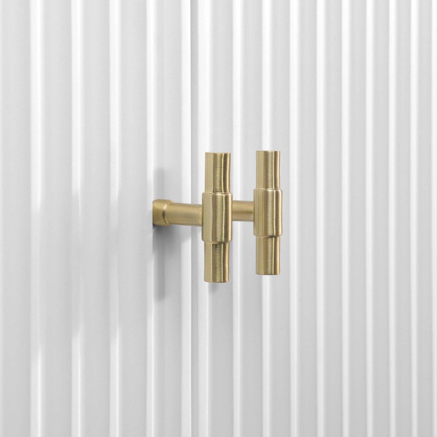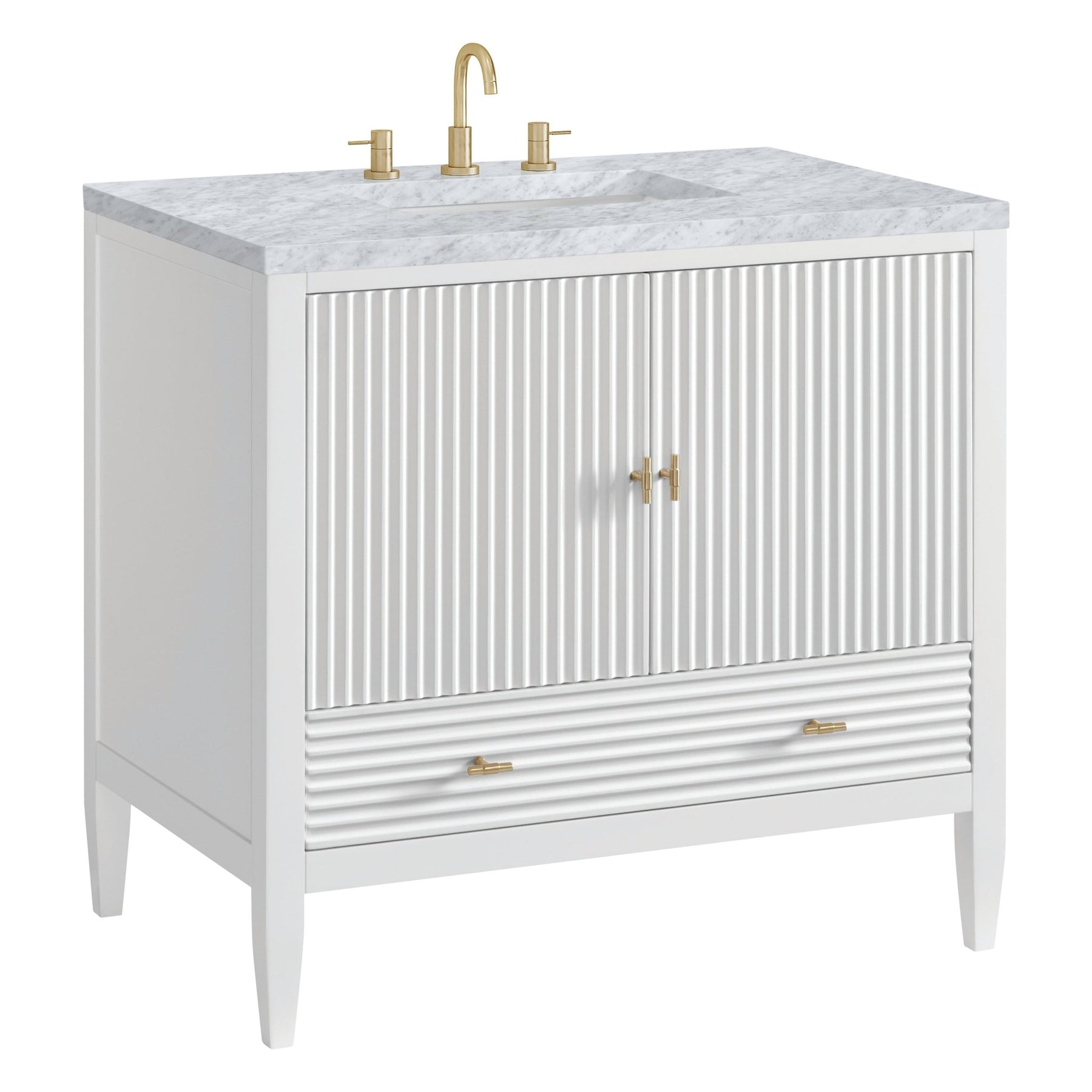 The 36" Myrrin Single Vanity features a minimalistic silhouette with fluted details, resulting in a blend of classical elegance and contemporary design. The deeply fluted panels run perpendicular on the doors and drawers, adding sophistication and visual interest to the design. Toggle-style knobs in Champagne Brass provide a luxe accent to the rich Bright White finish. The two-door cabinet opens to a spacious interior with a single shelf and a convenient USB/Electric power outlet. A single, lower-level drawer lends additional storage. Completing this vanity, are the treasured, neutral tones and textures of the Carrara marble vanity top display an white background with delicate grey veining.