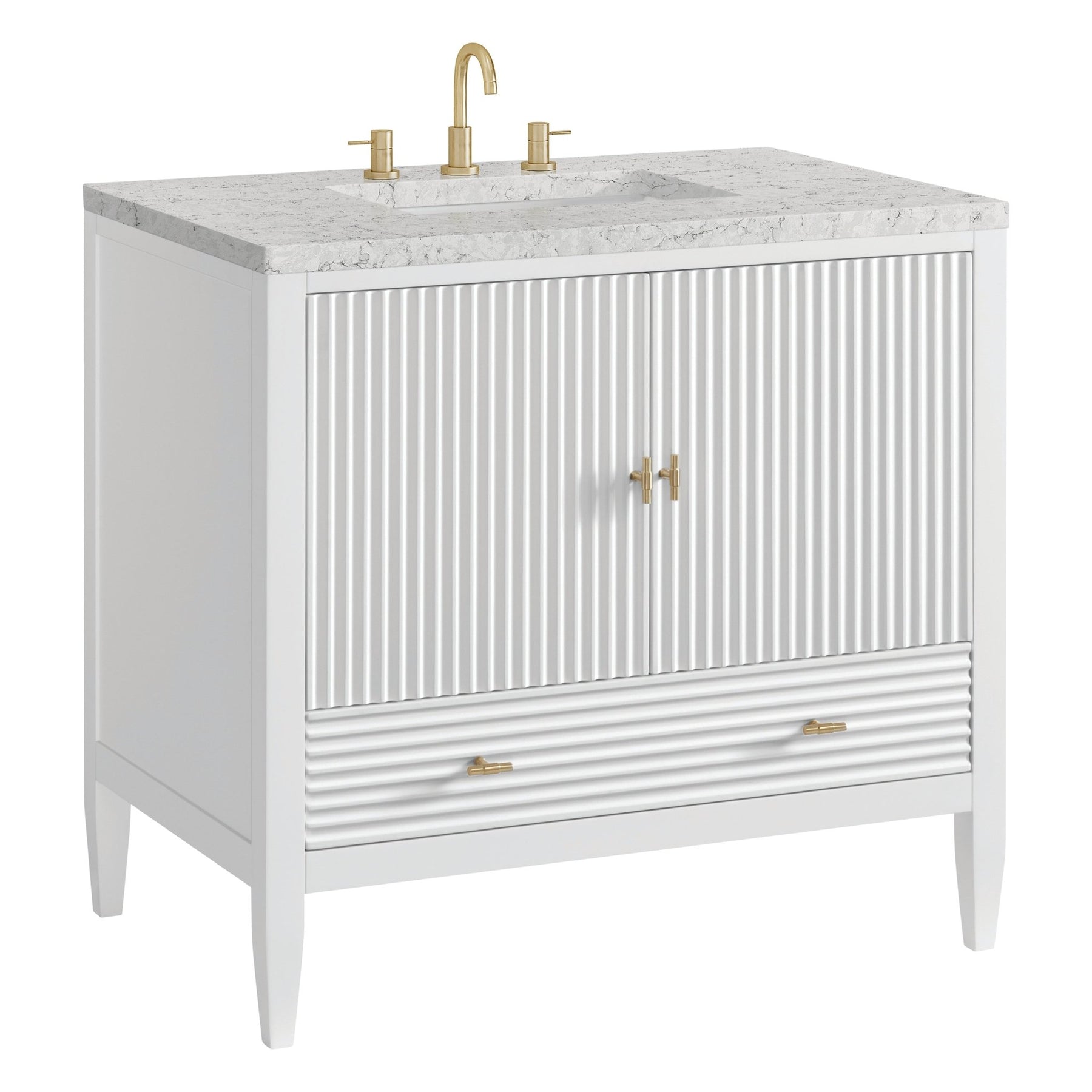 The 36" Myrrin Single Vanity features a minimalistic silhouette with fluted details, resulting in a blend of classical elegance and contemporary design. The deeply fluted panels run perpendicular on the doors and drawers, adding sophistication and visual interest to the design. Toggle-style knobs in Champagne Brass provide a luxe accent to the rich Bright White finish. The two-door cabinet opens to a spacious interior with a single shelf and a convenient USB/Electric power outlet. A single, lower-level drawer lends additional storage. Completing the look is the Eternal Jasmine Pearl Silestone top by Cosentino, featuring an elegant white background with subtle marbleized swirls and dark blue-gray veining patterns.
