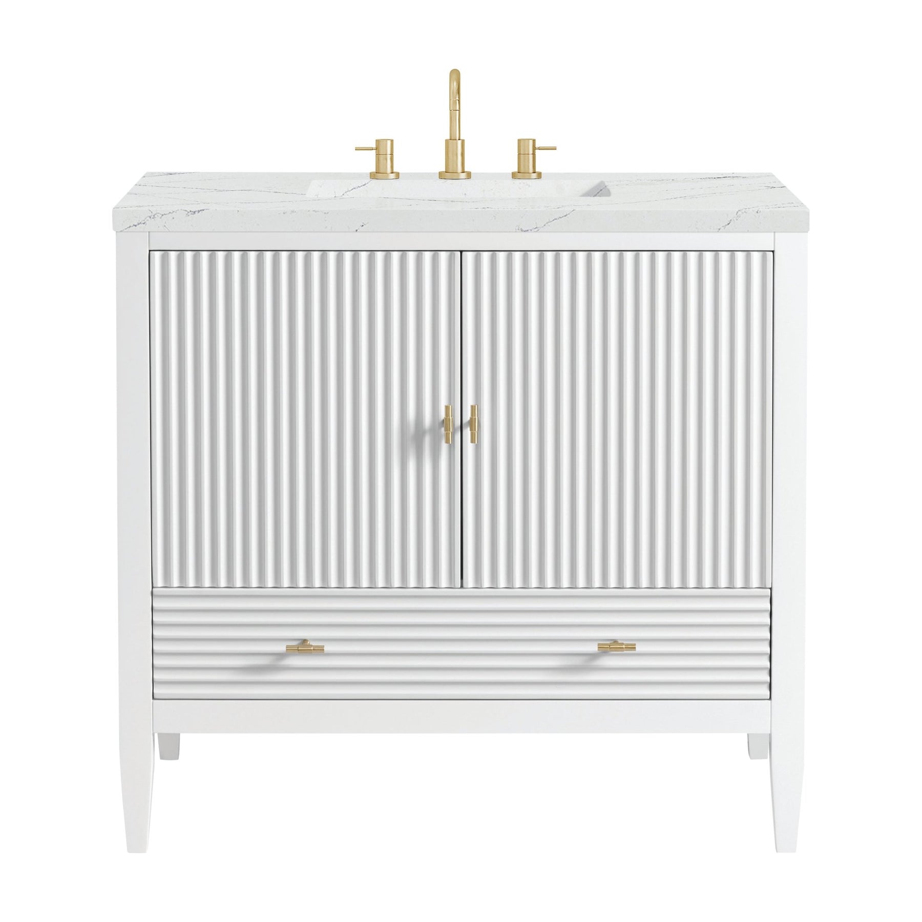 The 36" Myrrin Single Vanity features a minimalistic silhouette with fluted details, resulting in a blend of classical elegance and contemporary design. The deeply fluted panels run perpendicular on the doors and drawers, adding sophistication and visual interest to the design. Toggle-style knobs in Champagne Brass provide a luxe accent to the rich Bright White finish. The two-door cabinet opens to a spacious interior with a single shelf and a convenient USB/Electric power outlet. A single, lower-level drawer lends additional storage.