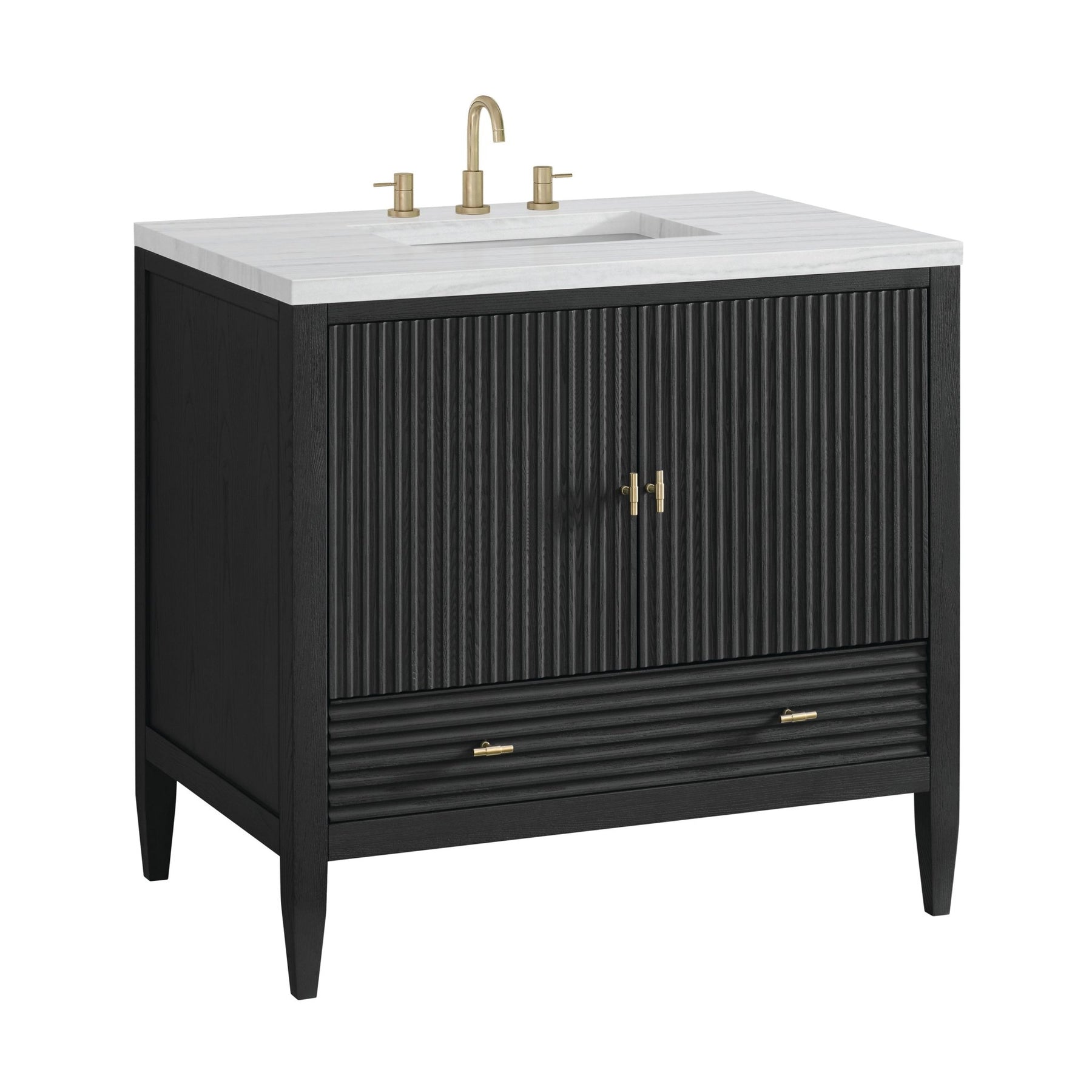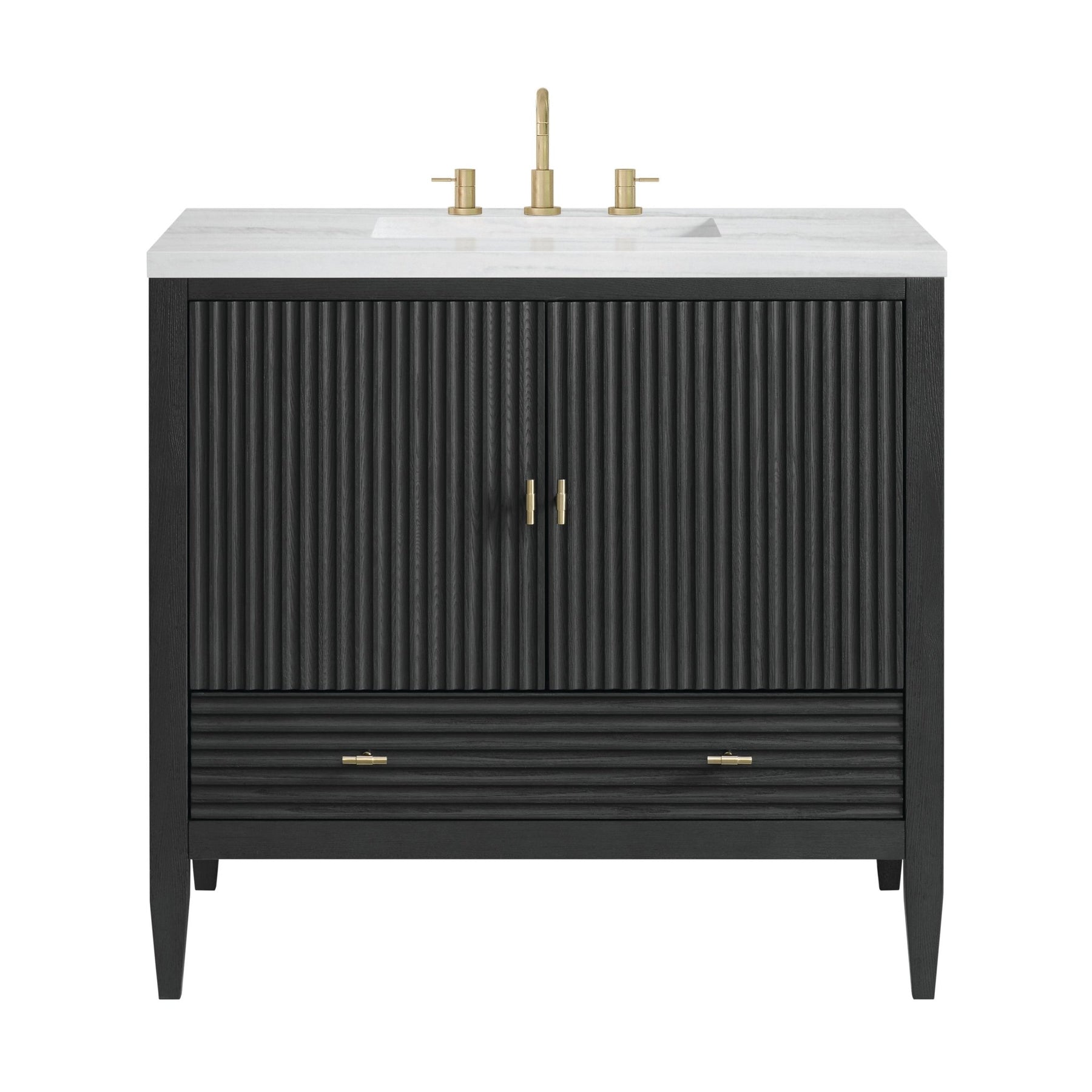 The 36" Myrrin Single Vanity features a minimalistic silhouette with fluted details, resulting in a blend of classical elegance and contemporary design. The deeply fluted panels run perpendicular on the doors and drawers, adding sophistication and visual interest to the design. Toggle-style knobs in Champagne Brass provide a luxe accent to the sophisticated Carbon Oak finish. The two-door cabinet opens to a spacious interior with a single shelf and a convenient USB/Electric power outlet. A single, lower-level drawer lends additional storage. Completing this beautiful vanity is a 3 cm solid surface Arctic Fall vanity top, which displays horizontal grey veining, giving you the look of classic marble with the benefits of modern technology.