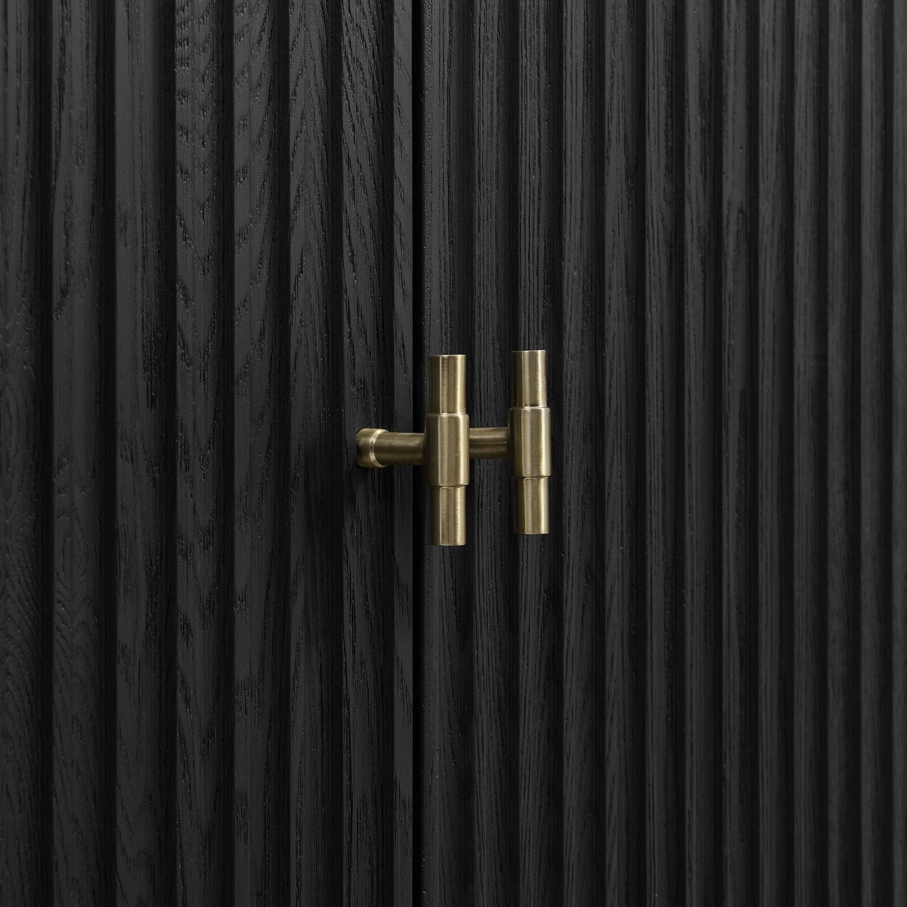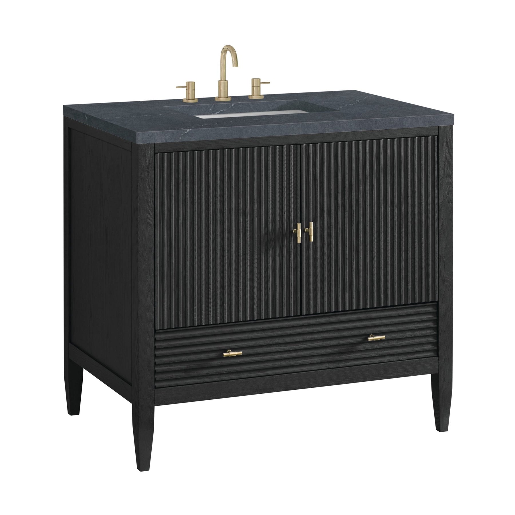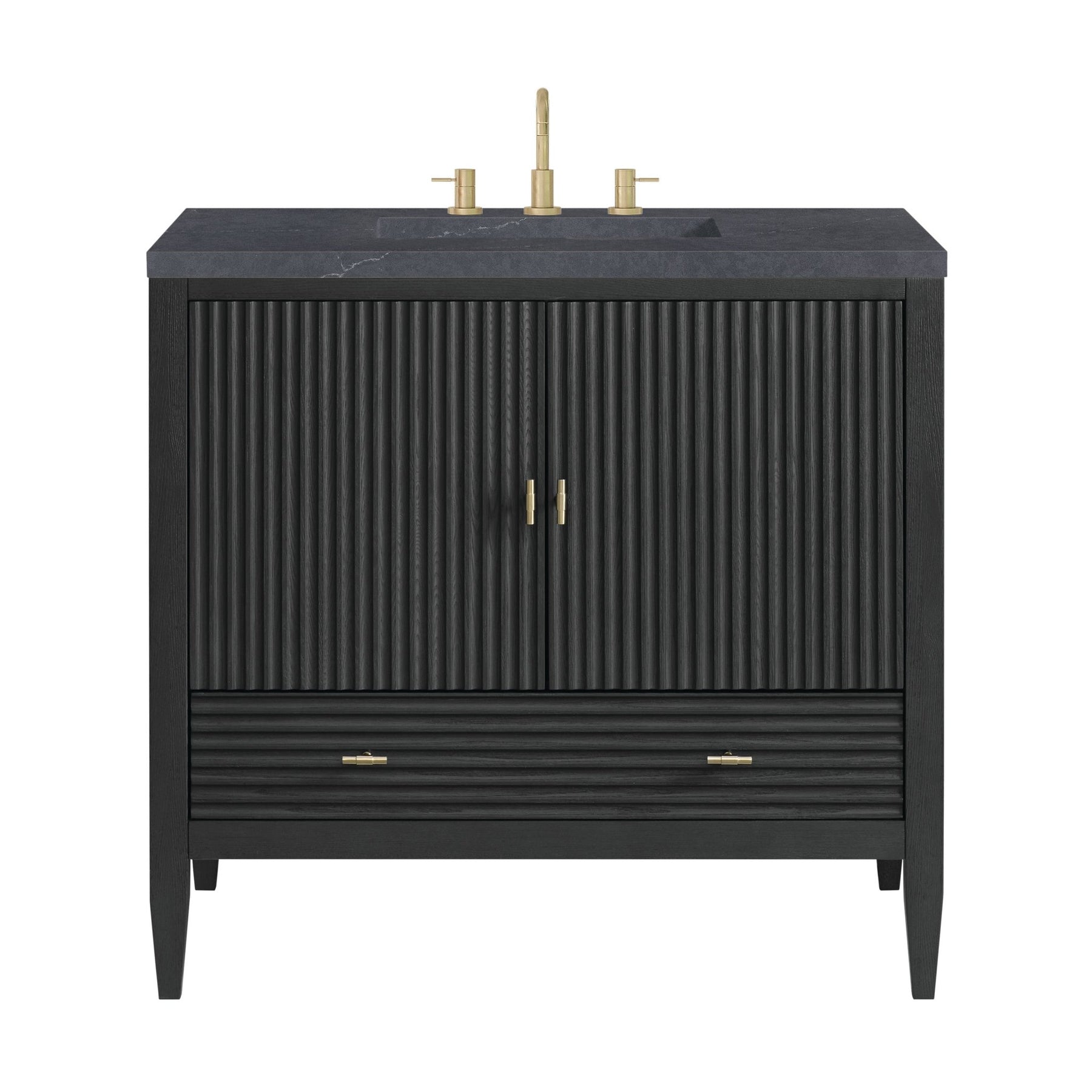 The 36" Myrrin Single Vanity features a minimalistic silhouette with fluted details, resulting in a blend of classical elegance and contemporary design. The deeply fluted panels run perpendicular on the doors and drawers, adding sophistication and visual interest to the design. Toggle-style knobs in Champagne Brass provide a luxe accent to the sophisticated Carbon Oak finish. The two-door cabinet opens to a spacious interior with a single shelf and a convenient USB/Electric power outlet. A single, lower-level drawer lends additional storage. Completing this piece is a distinguished top, characterized by depth and a sense of movement with a suede finish. The Charcoal Soapstone Silestone top is a timeless statement to complete the look of your vanity.