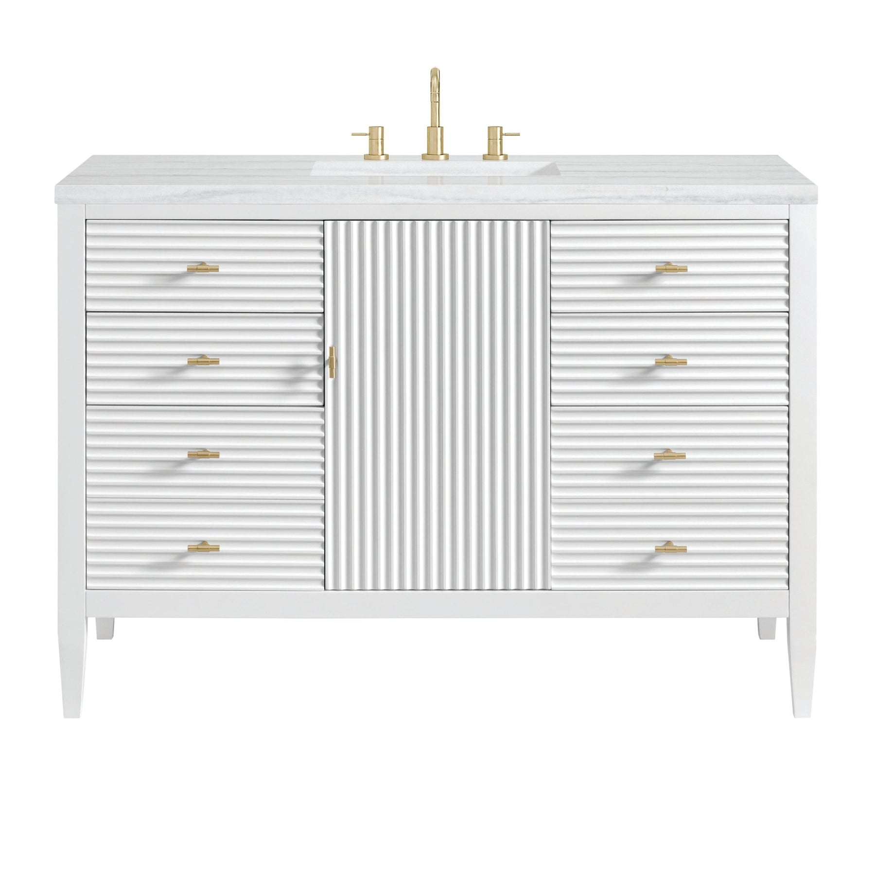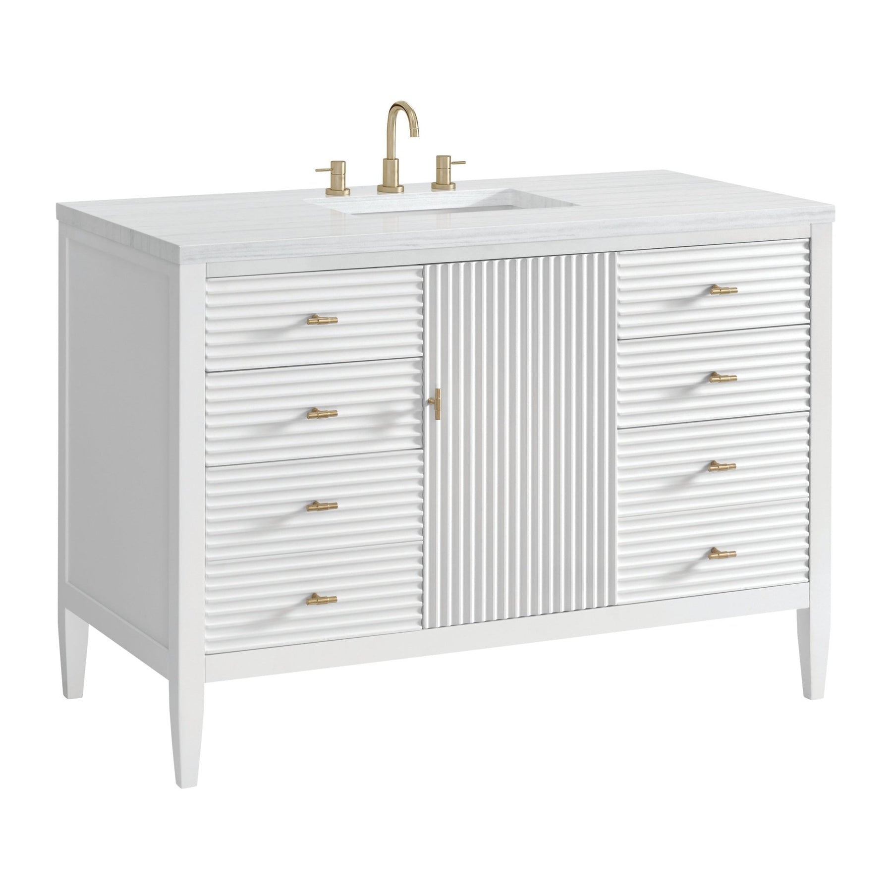 The 48" Myrrin Single Vanity features a minimalistic silhouette with fluted details, resulting in a blend of classical elegance and contemporary design. The deeply fluted panels run perpendicular on the doors and drawers, adding sophistication and visual interest to the design. Toggle-style knobs in Champagne Brass provide a luxe accent to the rich Bright White finish. The single-door cabinet opens to a spacious interior with a single shelf and a convenient USB/Electric power outlet. Six drawers lend additional storage. Completing this beautiful vanity is a 3 cm solid surface Arctic Fall vanity top, which displays horizontal grey veining, giving you the look of classic marble with the benefits of modern technology.