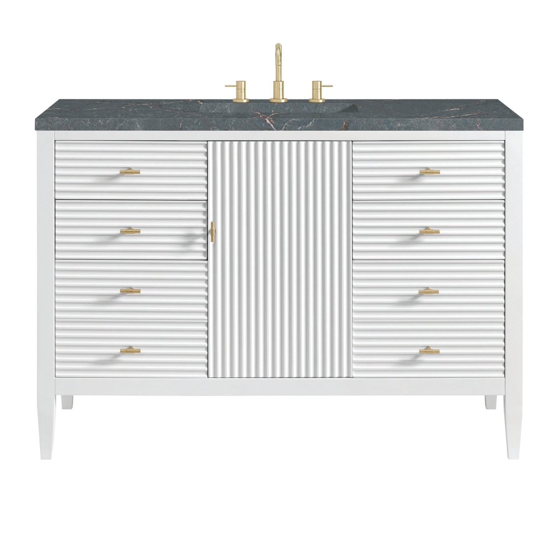 The 48" Myrrin Single Vanity features a minimalistic silhouette with fluted details, resulting in a blend of classical elegance and contemporary design. The deeply fluted panels run perpendicular on the doors and drawers, adding sophistication and visual interest to the design. Toggle-style knobs in Champagne Brass provide a luxe accent to the rich Bright White finish. The single-door cabinet opens to a spacious interior with a single shelf and a convenient USB/Electric power outlet. Six drawers lend additional storage. The finish and hardware accents are enhanced by the Parisien Blue Silestone top, offering a deep bluish hue with broad and intricate neutral veins highlighted by fine coppery accents.