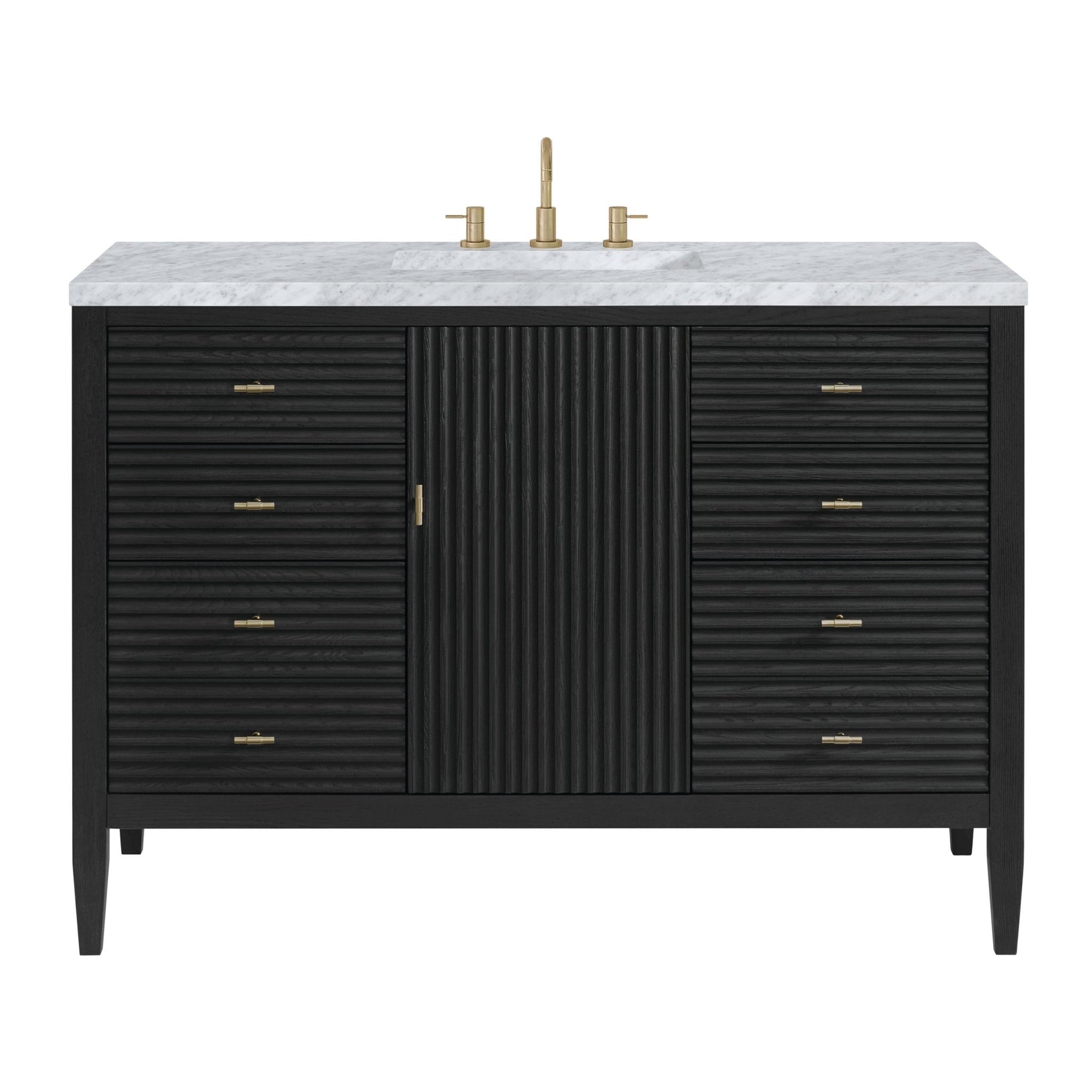 The 48" Myrrin Single Vanity features a minimalistic silhouette with fluted details, resulting in a blend of classical elegance and contemporary design. The deeply fluted panels run perpendicular on the doors and drawers, adding sophistication and visual interest to the design. Toggle-style knobs in Champagne Brass provide a luxe accent to the sophisticated Carbon Oak finish. The single-door cabinet opens to a spacious interior with a single shelf and a convenient USB/Electric power outlet. Six drawers lend additional storage. Completing this vanity, are the treasured, neutral tones and textures of the Carrara marble vanity top display an white background with delicate grey veining.