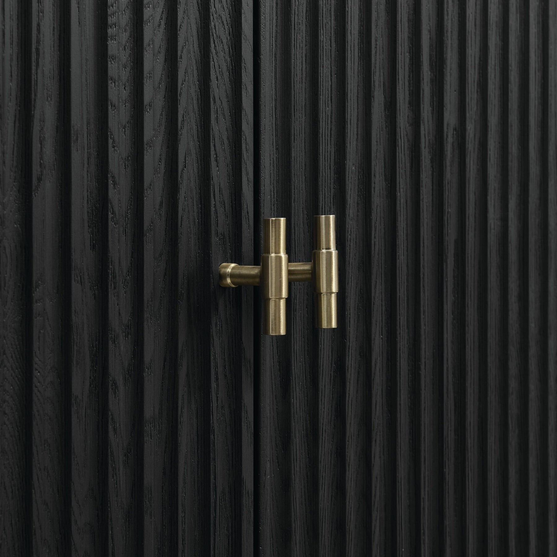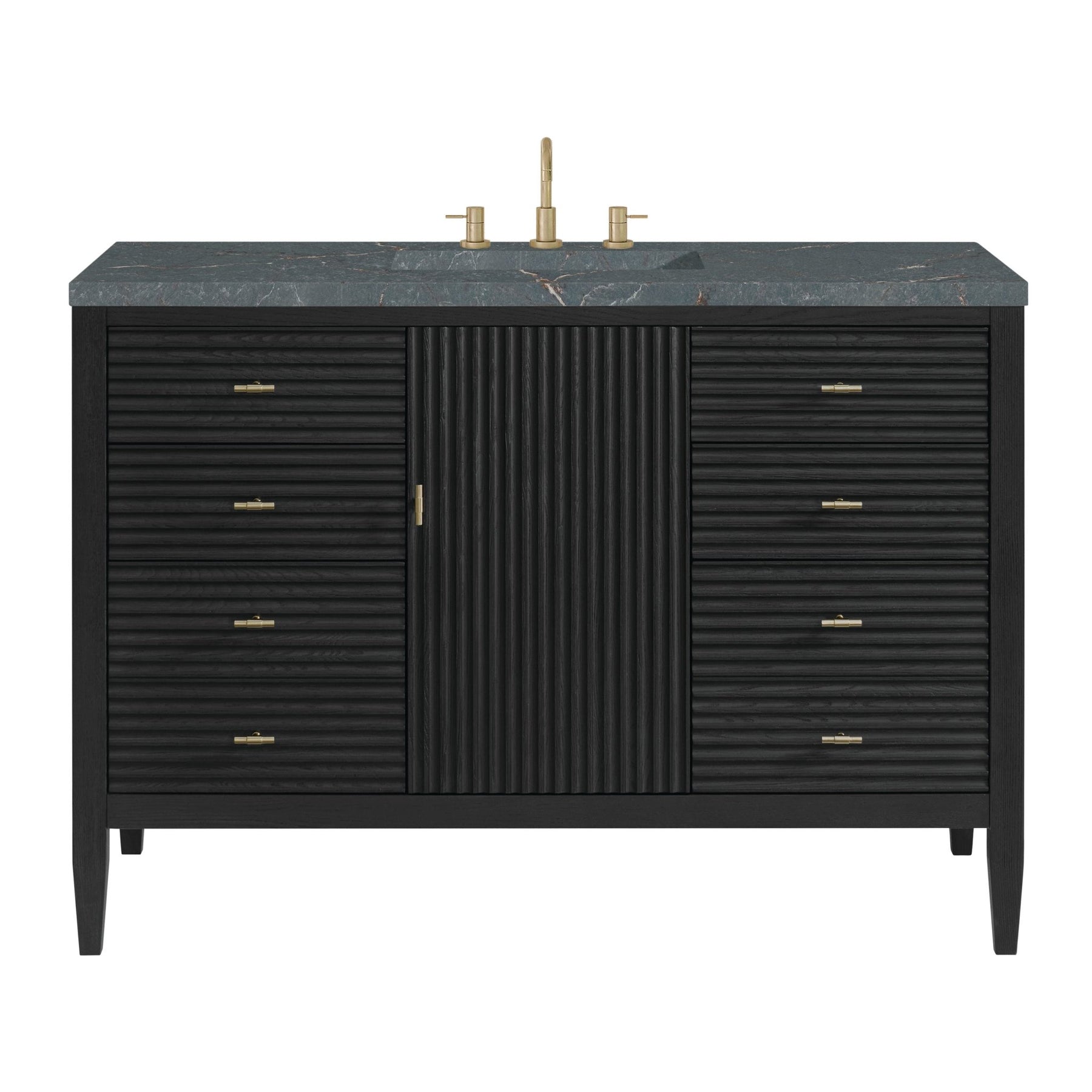 Featuring fluted detailing and a sleek silhouette, the Myrrin 48” Single Vanity brings Mid-Century charm and modern utility to your bathroom. Finished in a rich Carbon Oak and complemented by Champagne Brass T-shaped knobs, Myrrin offers generous storage. The single-door cabinet opens to a spacious interior with a single shelf and a convenient USB/120V power unit. Six full-extension drawers (two double-deep) lend additional storage. Completed with an elegant Parisien Bleu Silestone® top with undermount sink, this vanity is a seamless integration of modern design and functionality.