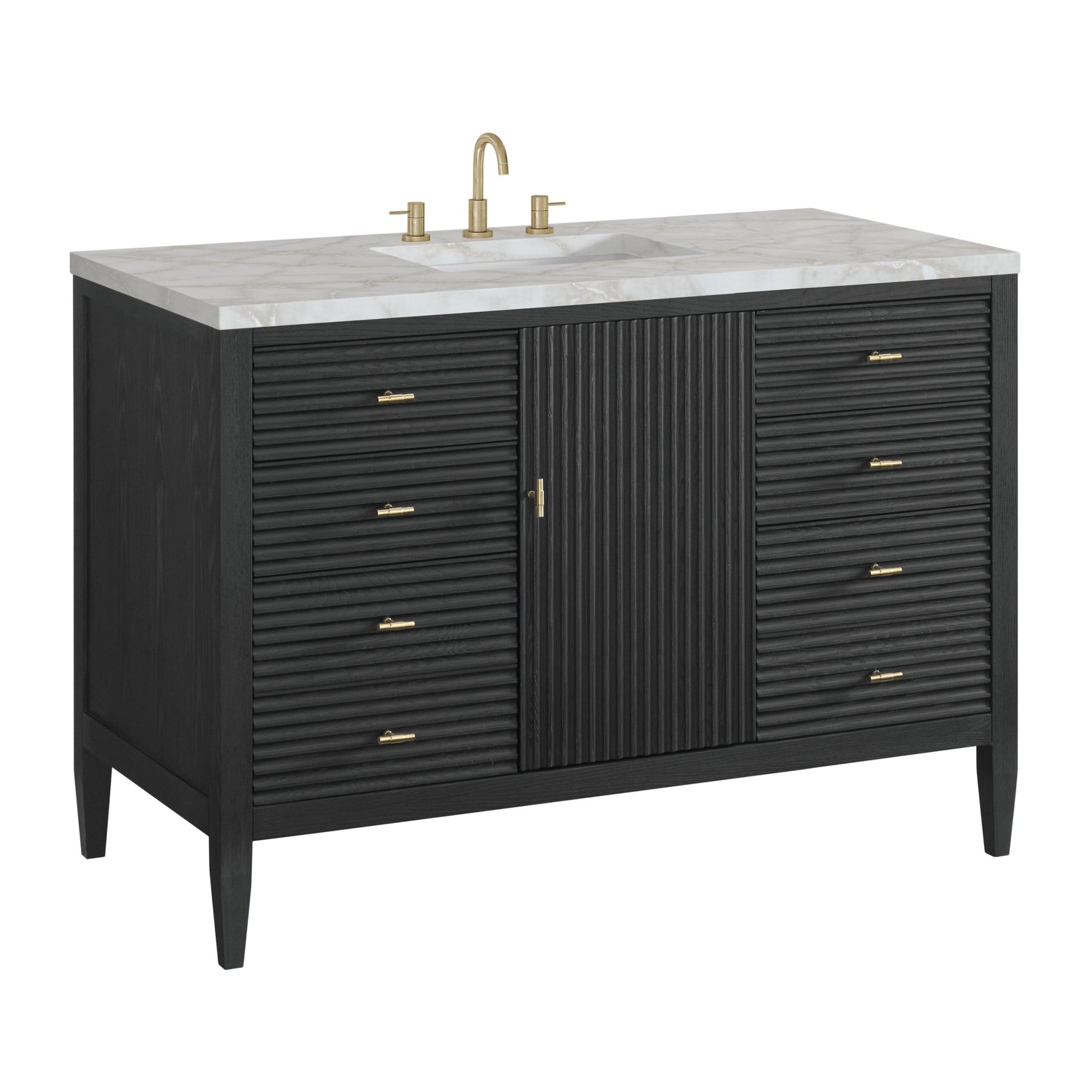 The 48" Myrrin Single Vanity features a minimalistic silhouette with fluted details, resulting in a blend of classical elegance and contemporary design. The deeply fluted panels run perpendicular on the doors and drawers, adding sophistication and visual interest to the design. Toggle-style knobs in Champagne Brass provide a luxe accent to the sophisticated Carbon Oak finish. The single-door cabinet opens to a spacious interior with a single shelf and a convenient USB/Electric power outlet. Six drawers lend additional storage. The finish is accented by the neutral background of the Victorian Silver Silestone top, boasting champagne metallic accents which seamlessly complete the look.