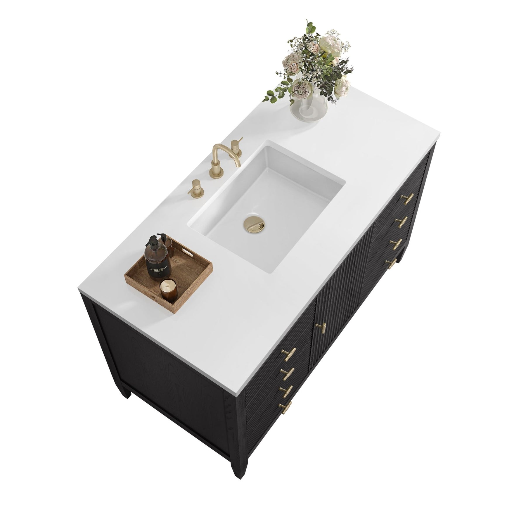 The 48" Myrrin Single Vanity features a minimalistic silhouette with fluted details, resulting in a blend of classical elegance and contemporary design. The deeply fluted panels run perpendicular on the doors and drawers, adding sophistication and visual interest to the design. Toggle-style knobs in Champagne Brass provide a luxe accent to the sophisticated Carbon Oak finish. The single-door cabinet opens to a spacious interior with a single shelf and a convenient USB/Electric power outlet. Six drawers lend additional storage. With the addition of a classic White Zeus Silestone top and undermount sink, this vanity is a seamless integration of modern design and functionality.