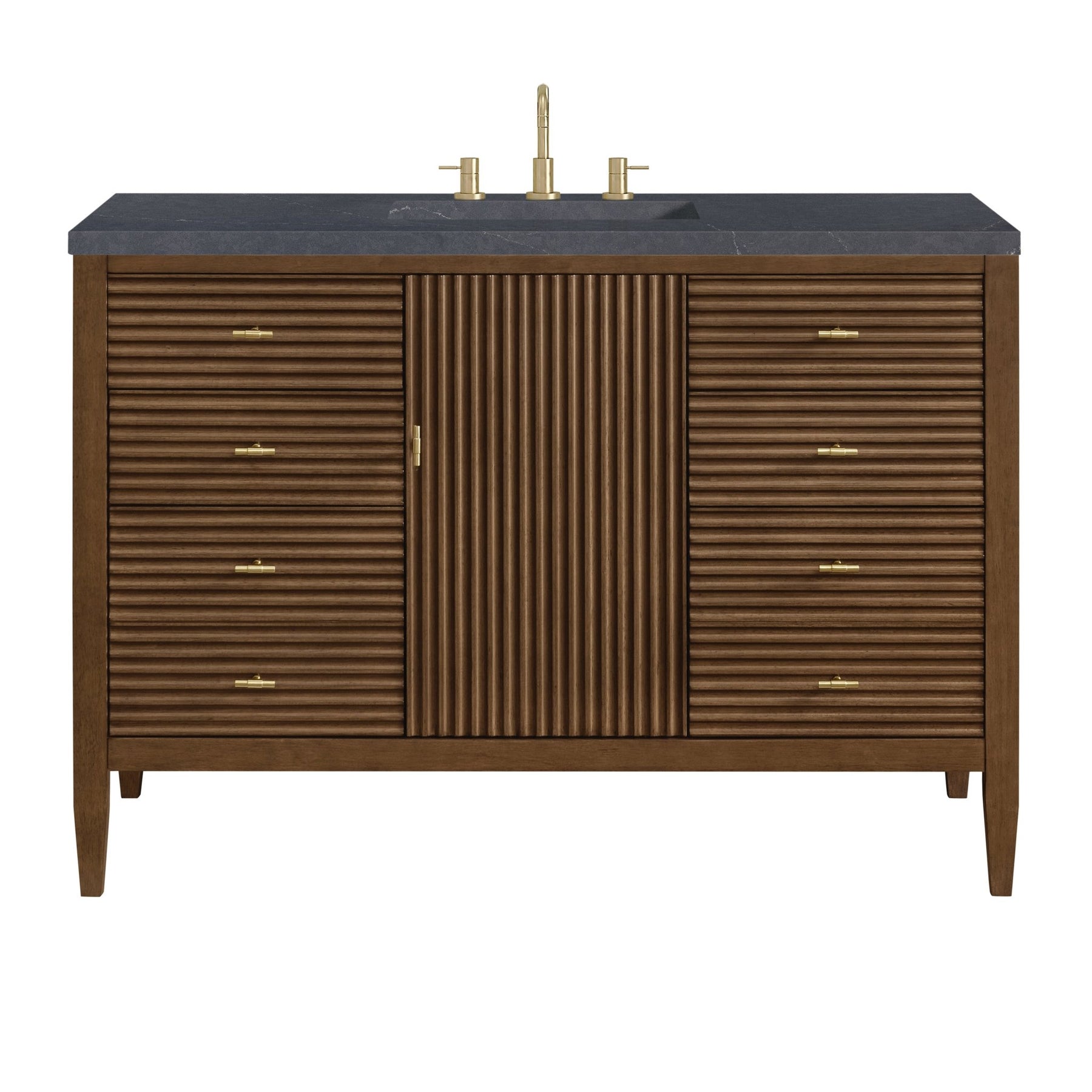 The 48" Myrrin Single Vanity features a minimalistic silhouette with fluted details, resulting in a blend of classical elegance and contemporary design. The deeply fluted panels run perpendicular on the doors and drawers, adding sophistication and visual interest to the design. Toggle-style knobs in Champagne Brass provide a luxe accent to the rich Mid-Century Walnut finish. The single-door cabinet opens to a spacious interior with a single shelf and a convenient USB/Electric power outlet. Six drawers lend additional storage. Completing this piece is a distinguished top, characterized by depth and a sense of movement with a suede finish. The Charcoal Soapstone Silestone top by Cosentino has the new n-boost technology, which helps prevent the adhesion of liquids, enhances shine, and intensifies the color of this top.