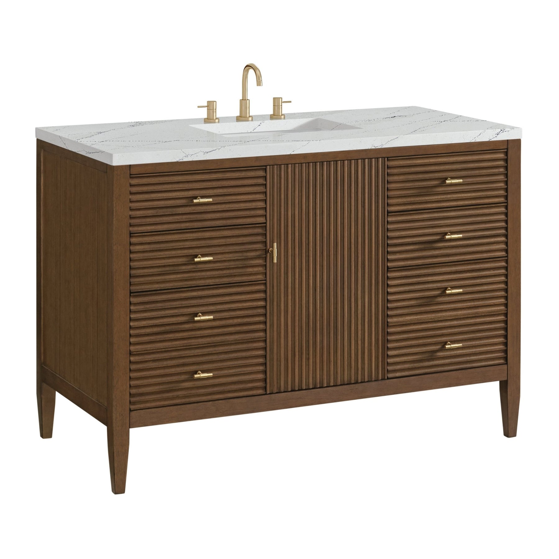 The 48" Myrrin Single Vanity features a minimalistic silhouette with fluted details, resulting in a blend of classical elegance and contemporary design. The deeply fluted panels run perpendicular on the doors and drawers, adding sophistication and visual interest to the design. Toggle-style knobs in Champagne Brass provide a luxe accent to the rich Mid-Century Walnut finish. The single-door cabinet opens to a spacious interior with a single shelf and a convenient USB/Electric power outlet. Six drawers lend additional storage. The addition of an Ethereal Noctis Silestone top by Cosentino with undermount rectangular sink completes this timeless bathroom centerpiece with its modern, intricate black and gray nuances which add contrast and elegance to the white background.