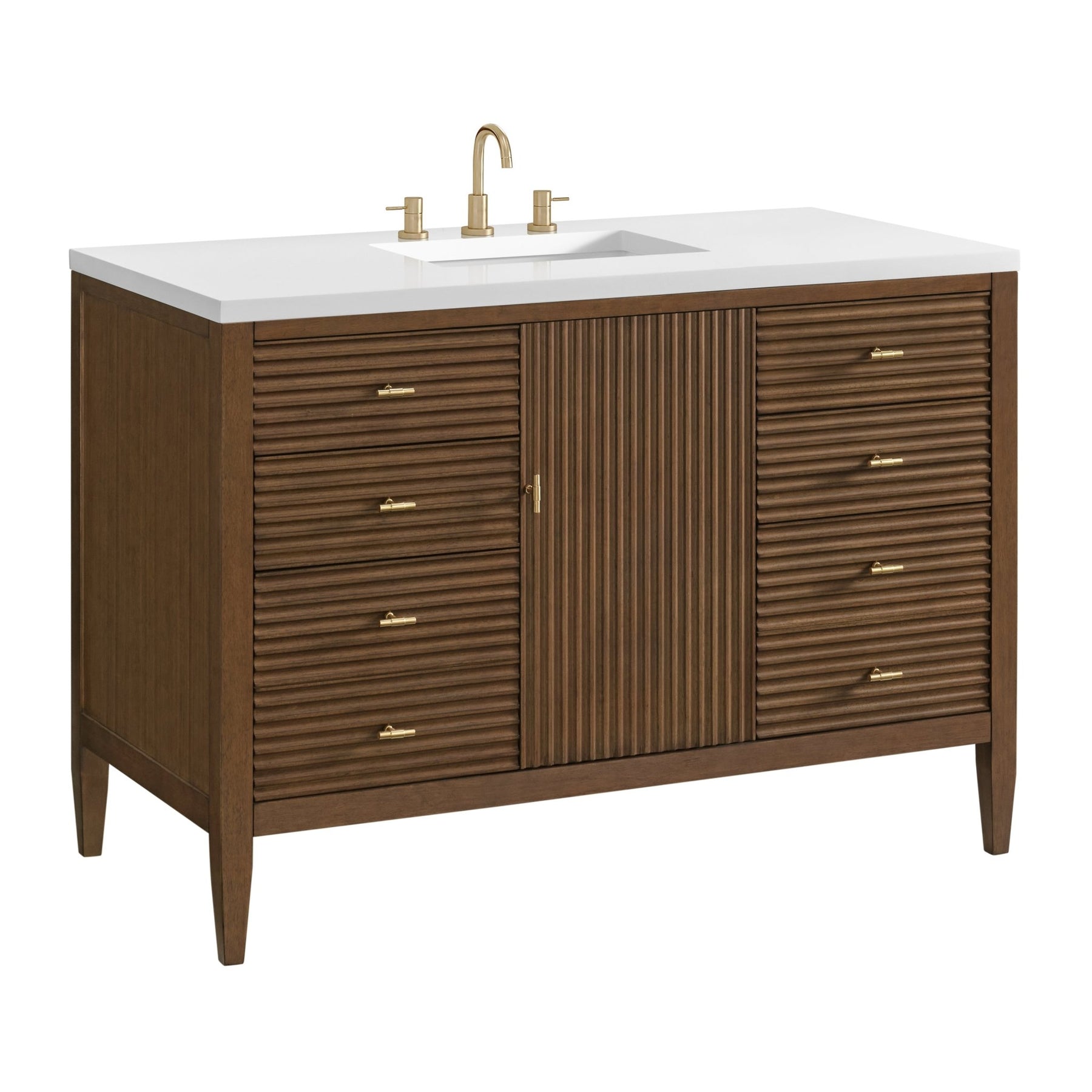The 48" Myrrin Single Vanity features a minimalistic silhouette with fluted details, resulting in a blend of classical elegance and contemporary design. The deeply fluted panels run perpendicular on the doors and drawers, adding sophistication and visual interest to the design. Toggle-style knobs in Champagne Brass provide a luxe accent to the rich Mid-Century Walnut finish. The single-door cabinet opens to a spacious interior with a single shelf and a convenient USB/Electric power outlet. Six drawers lend additional storage. With the addition of a classic White Zeus Silestone top and undermount sink, this vanity is a seamless integration of modern design and functionality.