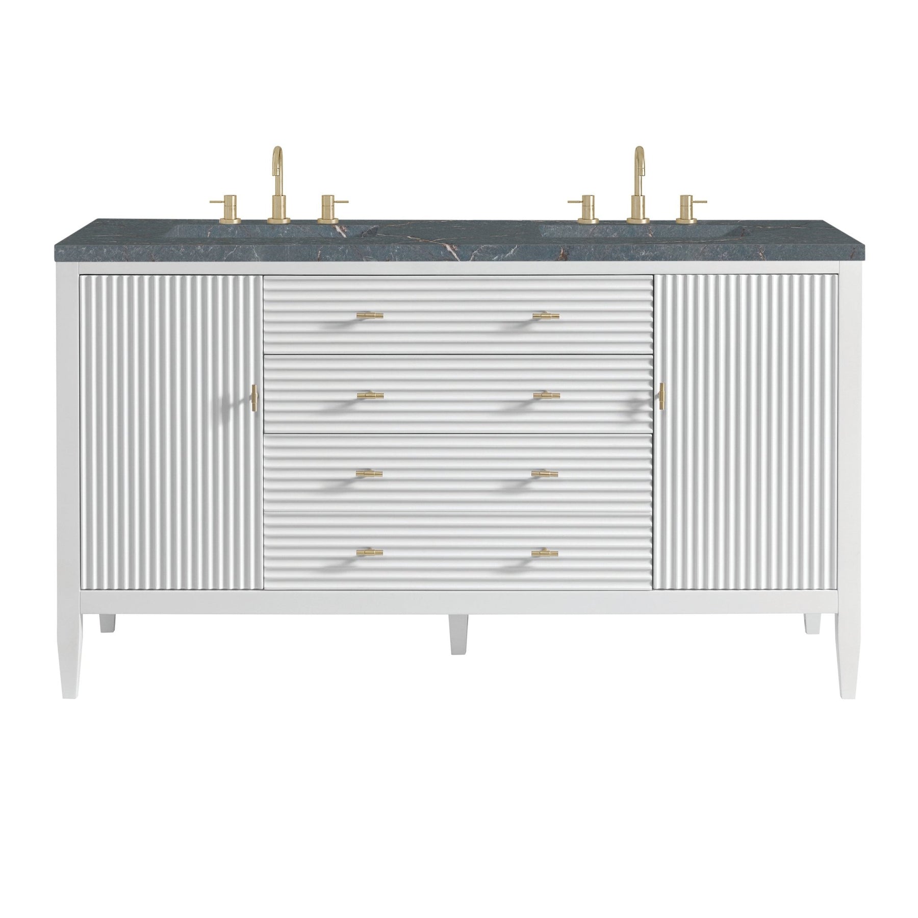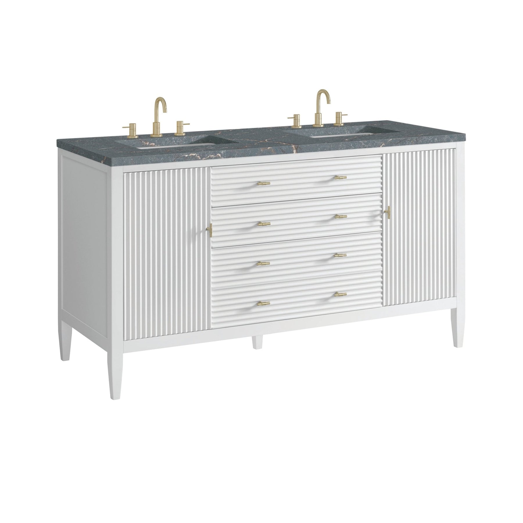 Featuring fluted detailing and a sleek silhouette, the Myrrin 60” Double Vanity brings Mid-Century charm and modern utility to your bathroom. Finished in Bright White and complemented by Champagne Brass T-shaped knobs, Myrrin offers generous storage. The two cabinet doors each open to reveal a spacious interior with a single shelf and a convenient USB/120V power unit for everyday convenience, with two full-extension drawers (one double-deep) and one top-row tip-out drawer for additional storage. Completed with an elegant Parisien Bleu Silestone® top with dual undermount sinks, this vanity is a seamless integration of modern design and functionality.