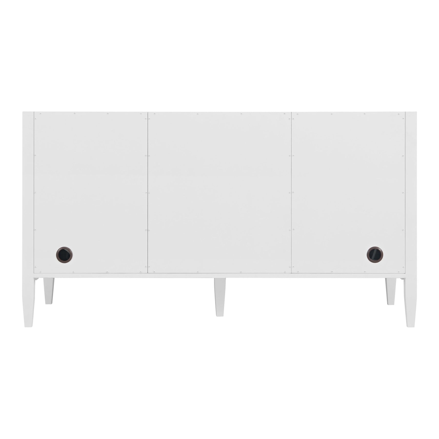 The 60" Myrrin Double Vanity features a minimalistic silhouette with fluted details, resulting in a blend of classical elegance and contemporary design. The deeply fluted panels run perpendicular on the doors and drawers, adding sophistication and visual interest to the design. Toggle-style knobs in Champagne Brass provide a luxe accent to the rich Bright White finish. The two-door cabinet opens to a spacious interior with a single shelf and a convenient USB/Electric power outlet. Two traditional drawers and a tip-out lend additional storage. The finish is accented by the neutral background of the Victorian Silver Silestone top, boasting champagne metallic accents which seamlessly complete the look.