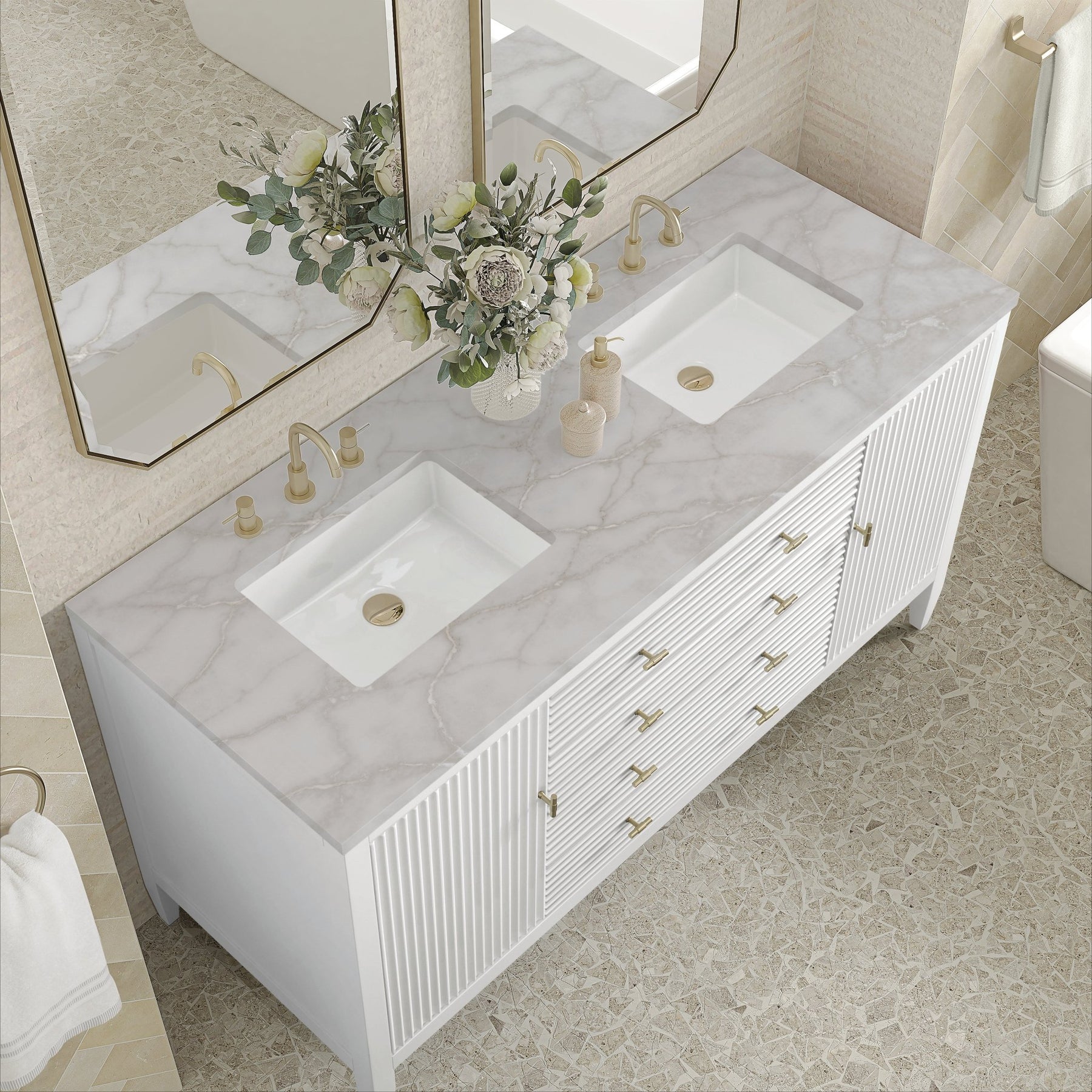 Featuring fluted detailing and a sleek silhouette, the Myrrin 60” Double Vanity brings Mid-Century charm and modern utility to your bathroom. Finished in Bright White and complemented by Champagne Brass T-shaped knobs, Myrrin offers generous storage. The two cabinet doors each open to reveal a spacious interior with a single shelf and a convenient USB/120V power unit for everyday convenience, with two full-extension drawers (one double-deep) and one top-row tip-out drawer for additional storage. Completed with an elegant Victorian Silver Silestone® top with dual undermount sinks, this vanity is a seamless integration of modern design and functionality.