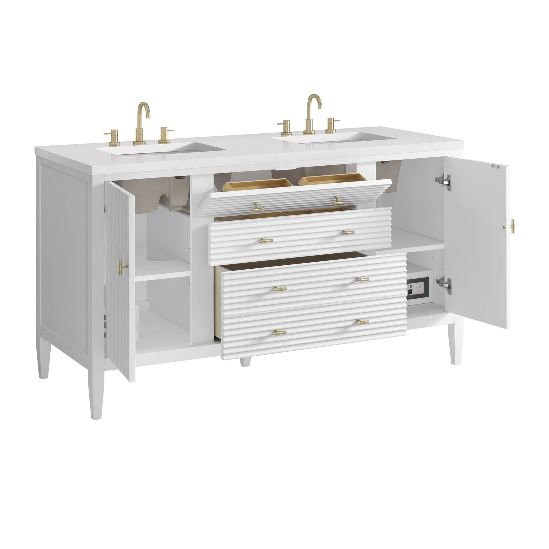 The 60" Myrrin Double Vanity features a minimalistic silhouette with fluted details, resulting in a blend of classical elegance and contemporary design. The deeply fluted panels run perpendicular on the doors and drawers, adding sophistication and visual interest to the design. Toggle-style knobs in Champagne Brass provide a luxe accent to the rich Bright White finish. The two-door cabinet opens to a spacious interior with a single shelf and a convenient USB/Electric power outlet. Two traditional drawers and a tip-out lend additional storage. With the addition of a classic White Zeus Silestone top and undermount sink, this vanity is a seamless integration of modern design and functionality.