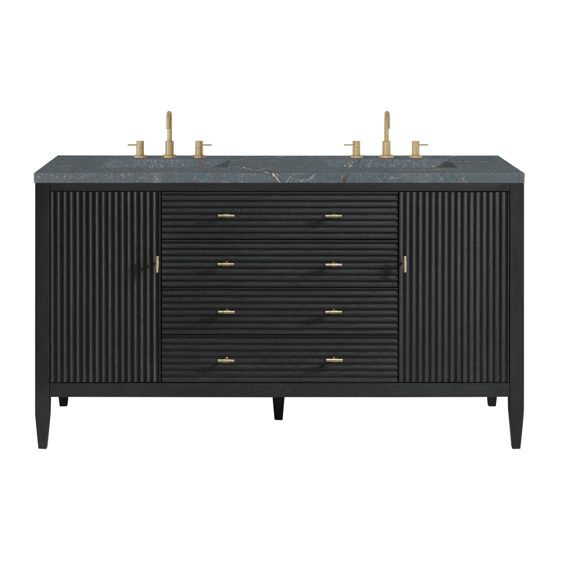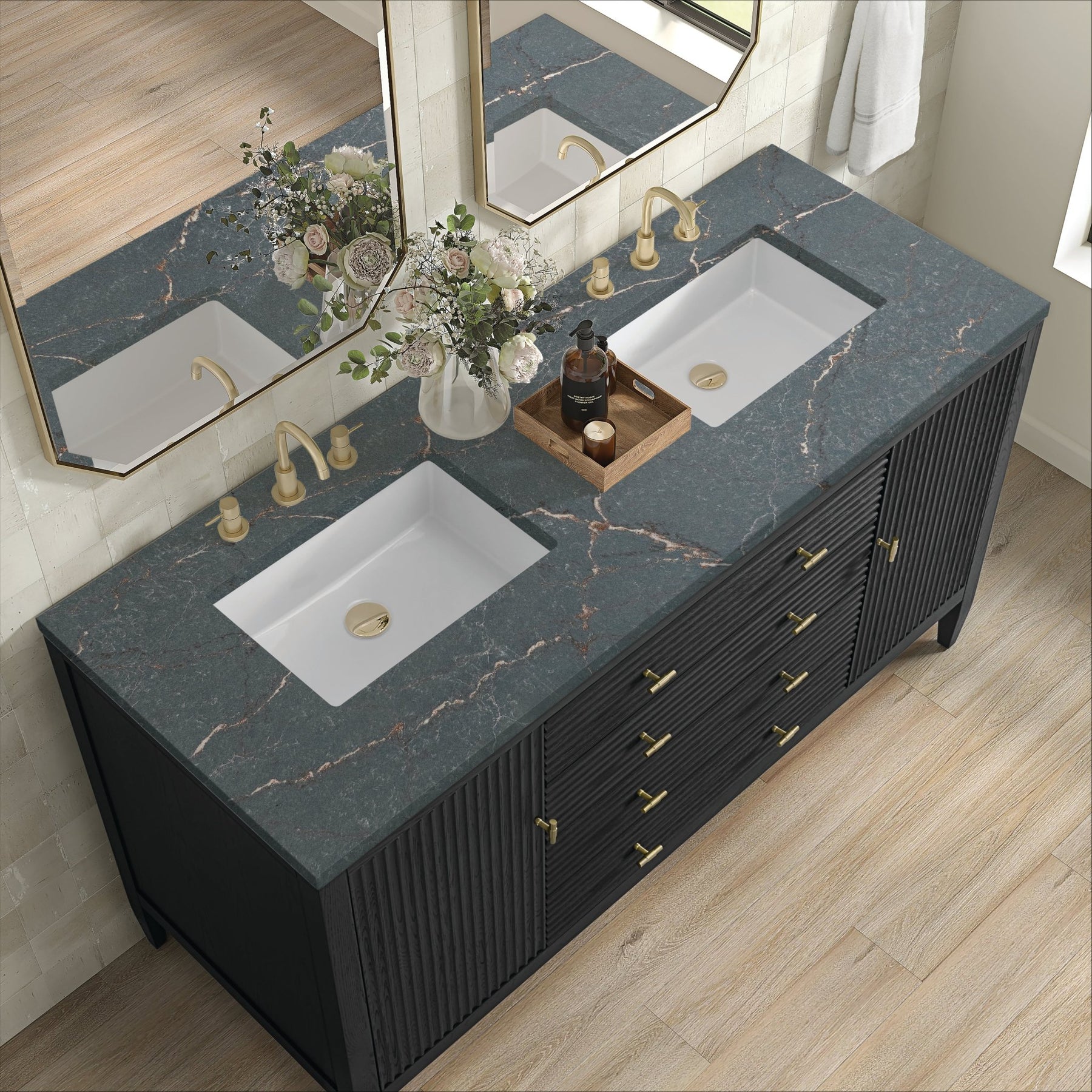 The 60" Myrrin Double Vanity features a minimalistic silhouette with fluted details, resulting in a blend of classical elegance and contemporary design. The deeply fluted panels run perpendicular on the doors and drawers, adding sophistication and visual interest to the design. Toggle-style knobs in Champagne Brass provide a luxe accent to the sophisticated Carbon Oak finish. The two-door cabinet opens to a spacious interior with a single shelf and a convenient USB/Electric power outlet. Two traditional drawers and a tip-out lend additional storage. The finish and hardware accents are enhanced by the Parisien Blue Silestone top, offering a deep bluish hue with broad and intricate neutral veins highlighted by fine coppery accents.