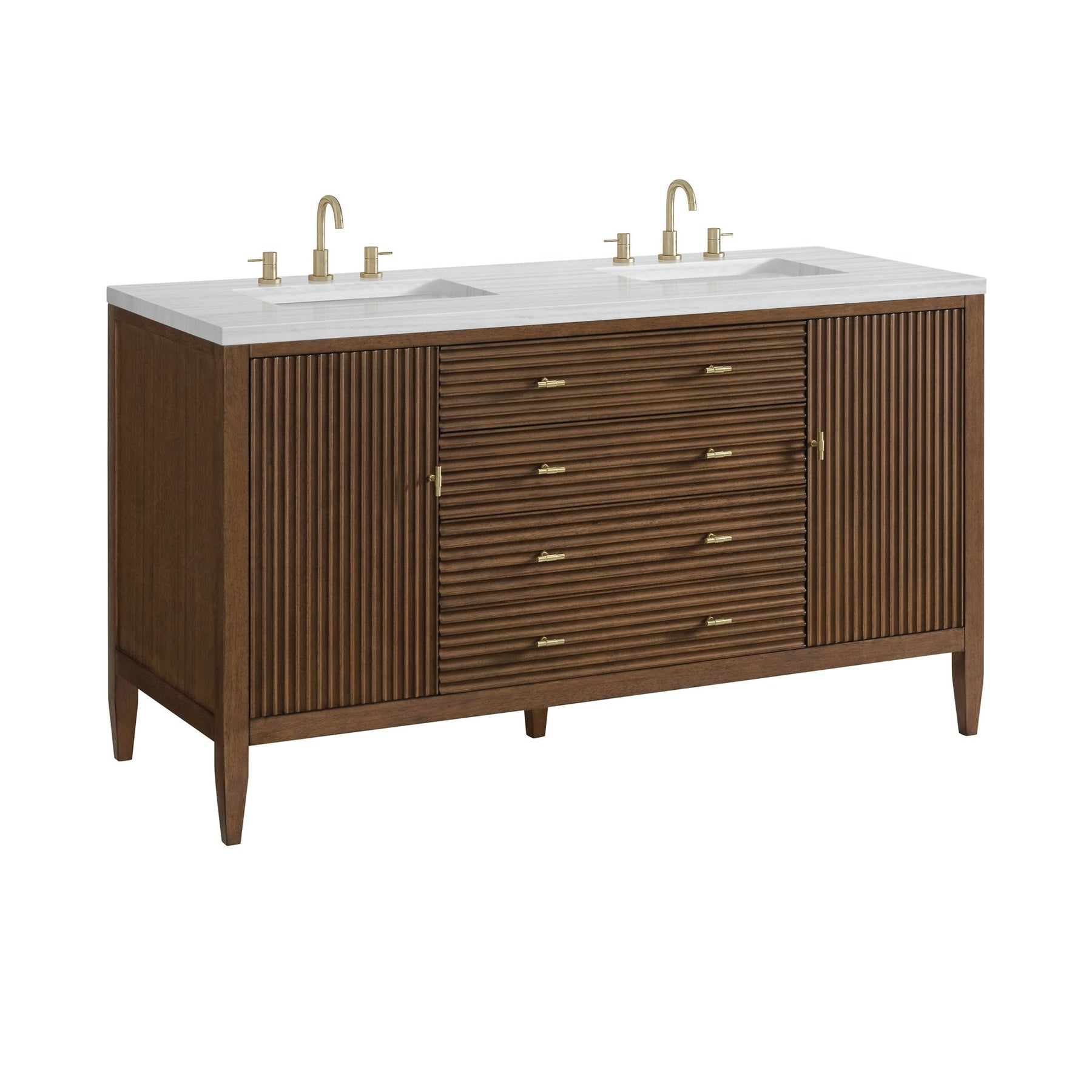 The 60" Myrrin Double Vanity features a minimalistic silhouette with fluted details, resulting in a blend of classical elegance and contemporary design. The deeply fluted panels run perpendicular on the doors and drawers, adding sophistication and visual interest to the design. Toggle-style knobs in Champagne Brass provide a luxe accent to the rich Mid-Century Walnut finish. The two-door cabinet opens to a spacious interior with a single shelf and a convenient USB/Electric power outlet. Two traditional drawers and a tip-out lend additional storage. Completing this beautiful vanity is a 3 cm solid surface Arctic Fall vanity top, which displays horizontal grey veining, giving you the look of classic marble with the benefits of modern technology.