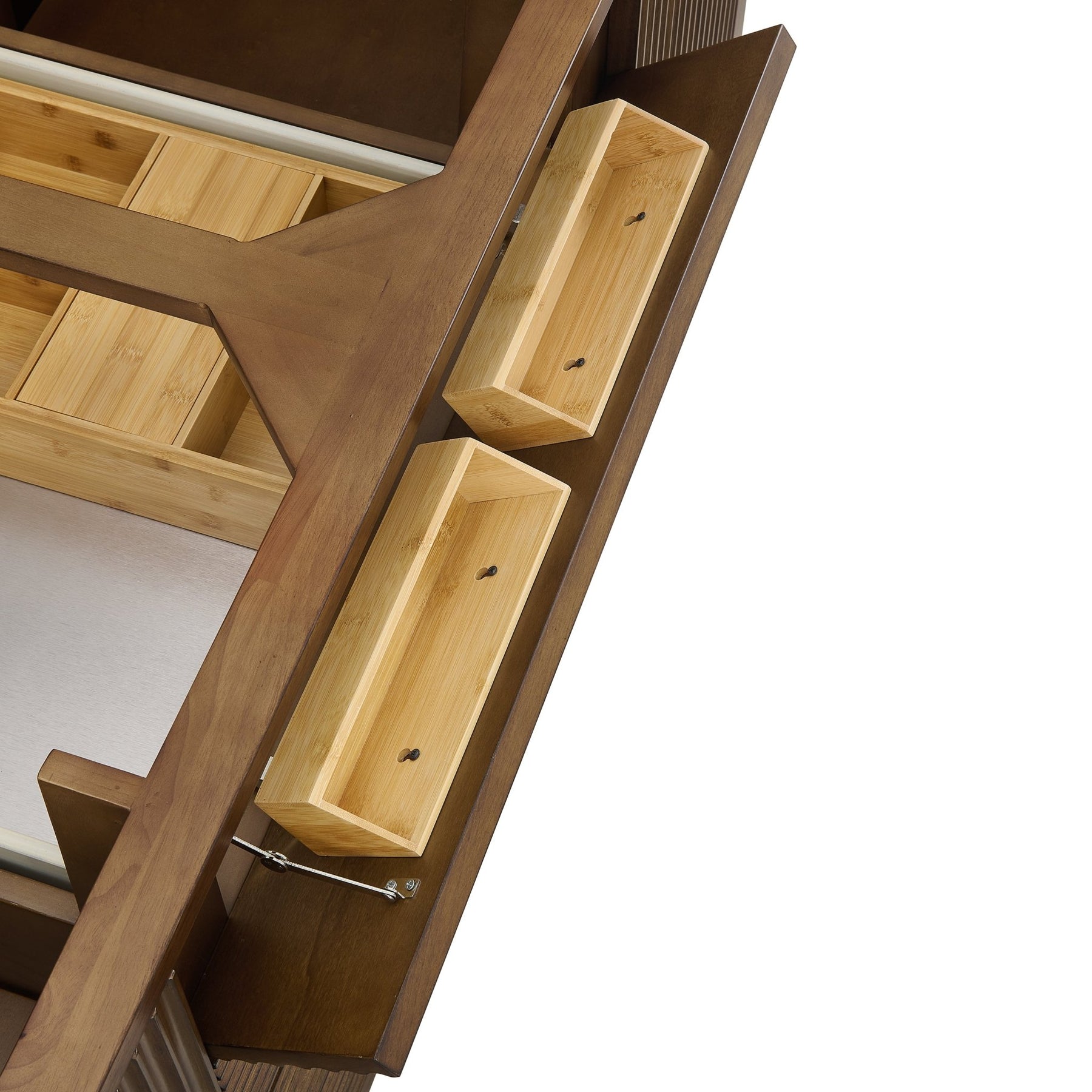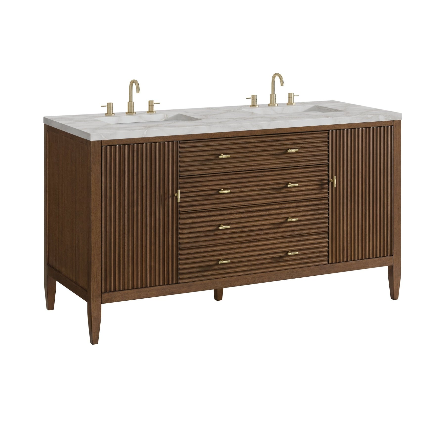 Featuring fluted detailing and a sleek silhouette, the Myrrin 60” Double Vanity brings Mid-Century charm and modern utility to your bathroom. Finished in a rich Mid-Century Walnut and complemented by Champagne Brass T-shaped knobs, Myrrin offers generous storage. The two cabinet doors each open to reveal a spacious interior with a single shelf and a convenient USB/120V power unit for everyday convenience, with two full-extension drawers (one double-deep) and one top-row tip-out drawer for additional storage. Completed with an elegant Victorian Silver Silestone® top with dual undermount sinks, this vanity is a seamless integration of modern design and functionality.