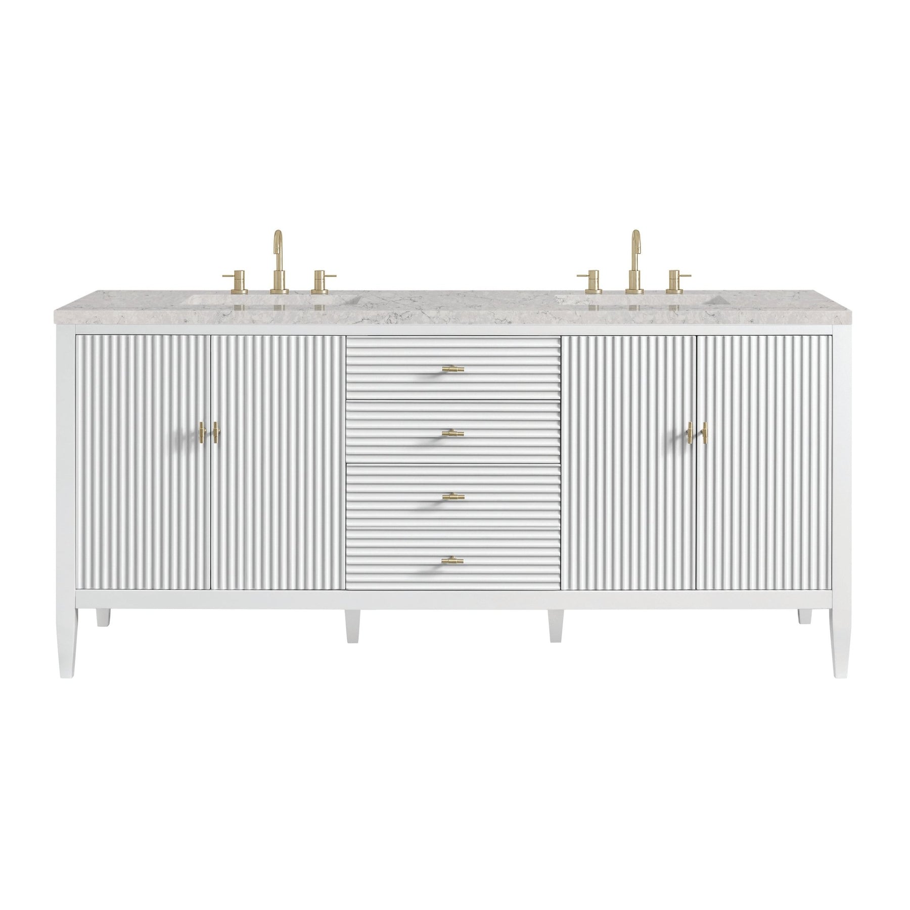 The 72" Myrrin Double Vanity features a minimalistic silhouette with fluted details, resulting in a blend of classical elegance and contemporary design. The deeply fluted panels run perpendicular on the doors and drawers, adding sophistication and visual interest to the design. Toggle-style knobs in Champagne Brass provide a luxe accent to the rich Bright White finish. The four-door cabinet opens to a spacious interior with a single shelf and convenient USB/Electric power outlets. Three drawers lend additional storage. Completing the look is the Eternal Jasmine Pearl Silestone top by Cosentino, featuring an elegant white background with subtle marbleized swirls and dark blue-gray veining patterns.