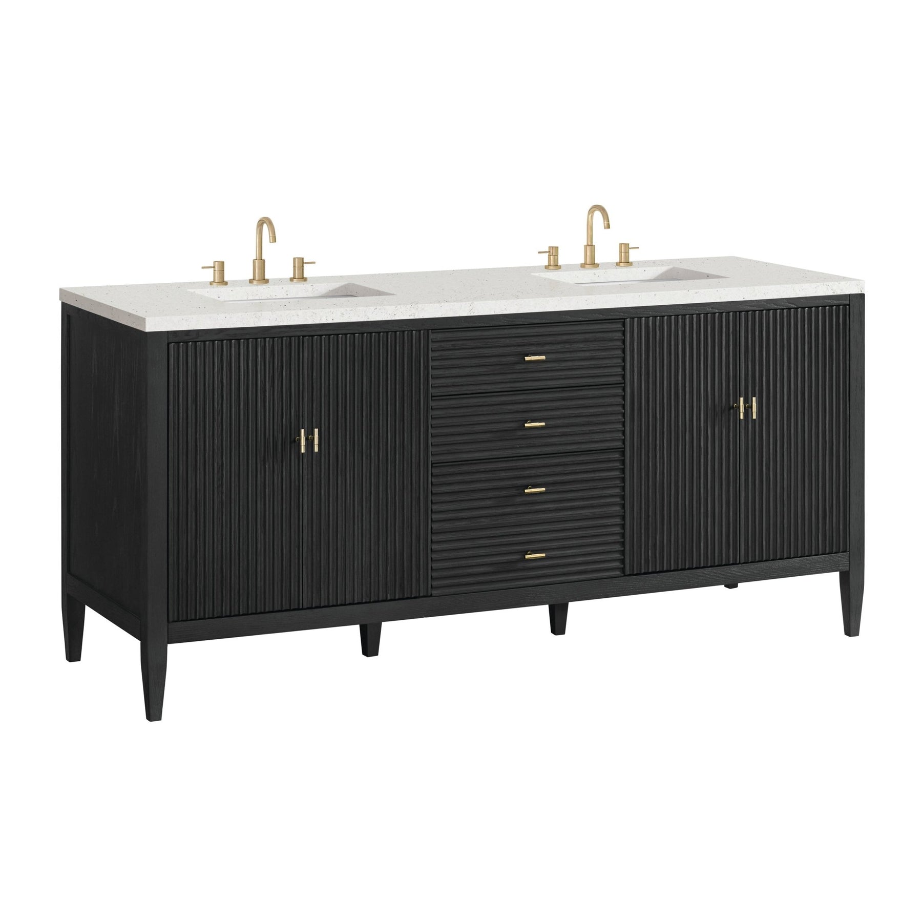 The 72" Myrrin Double Vanity features a minimalistic silhouette with fluted details, resulting in a blend of classical elegance and contemporary design. The deeply fluted panels run perpendicular on the doors and drawers, adding sophistication and visual interest to the design. Toggle-style knobs in Champagne Brass provide a luxe accent to the sophisticated Carbon Oak finish. The four-door cabinet opens to a spacious interior with a single shelf and convenient USB/Electric power outlets. Three drawers lend additional storage. The Lime Delight Silestone top lends warm, textured beige tones to perfectly complement the finish on the vanity.