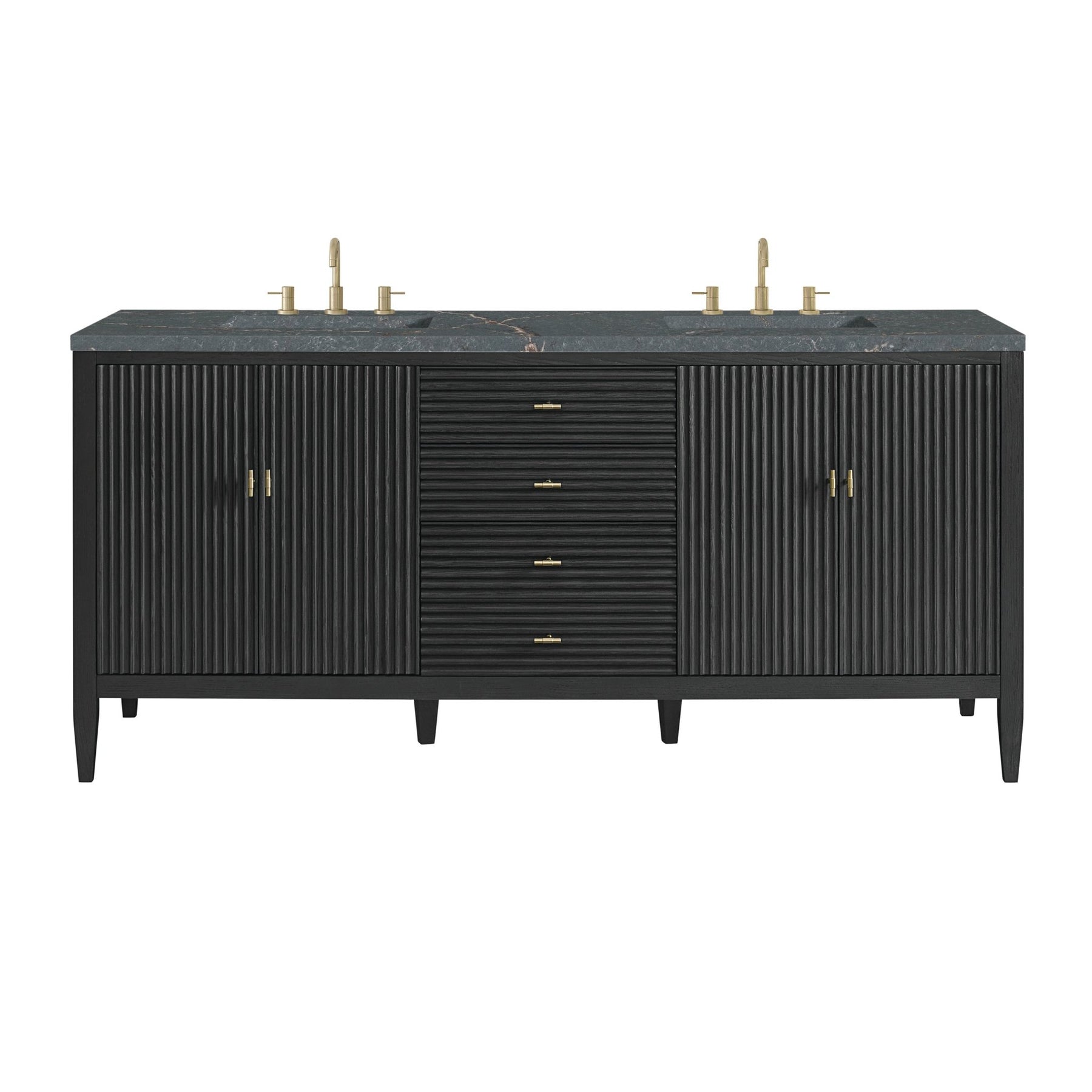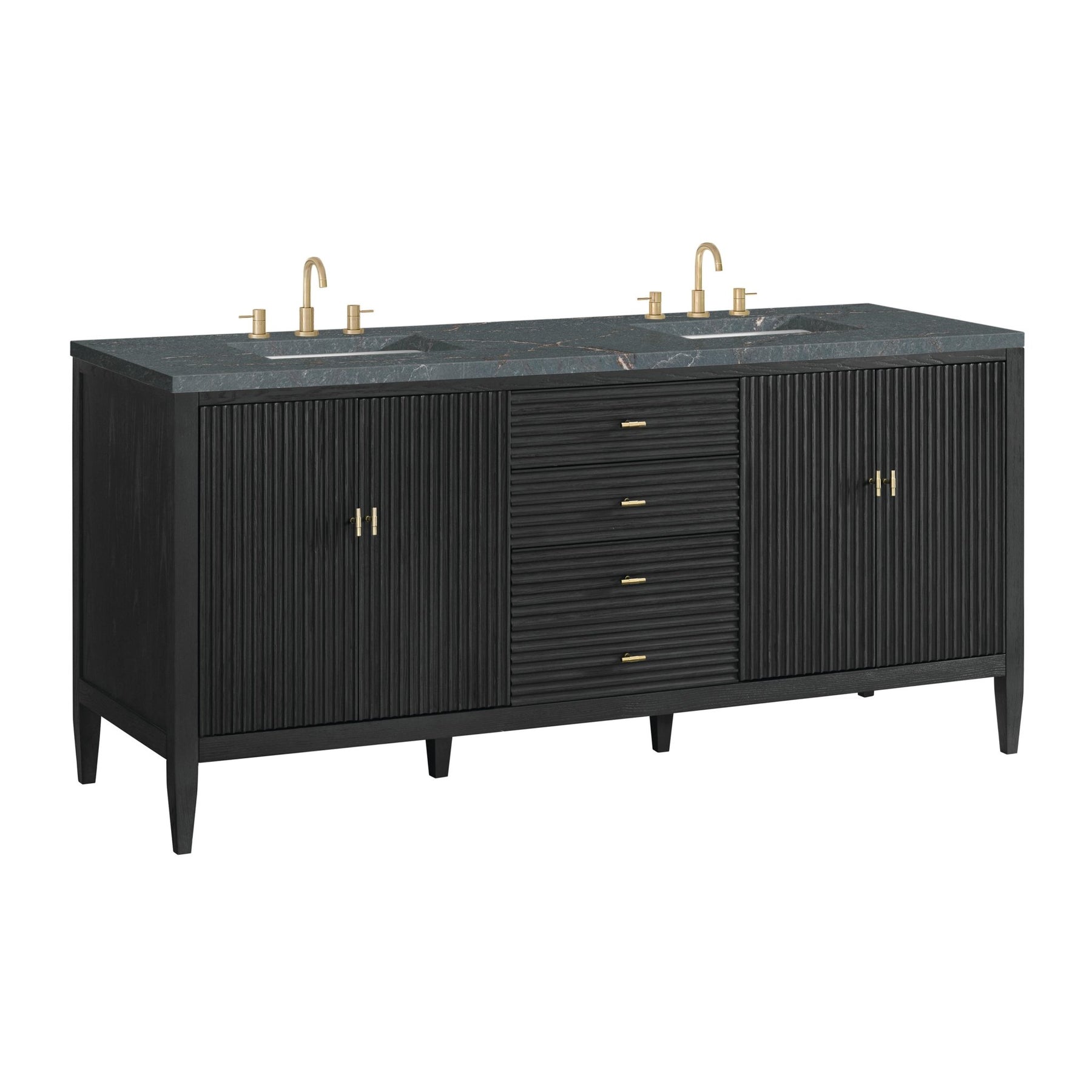 Featuring fluted detailing and a sleek silhouette, the Myrrin 72” Double Vanity brings Mid-Century charm and modern utility to your bathroom. Finished in a rich Carbon Oak and complemented by Champagne Brass T-shaped knobs, Myrrin offers generous storage. The two double-door cabinets each open to reveal a spacious interior with a single shelf and a convenient USB/120V power unit for everyday convenience, with three full-extension drawers (one double-deep) lending additional storage. The finish and hardware accents are enhanced by the Parisien Blue Silestone® top, offering a deep bluish hue with broad and intricate neutral veins highlighted by fine coppery accents.