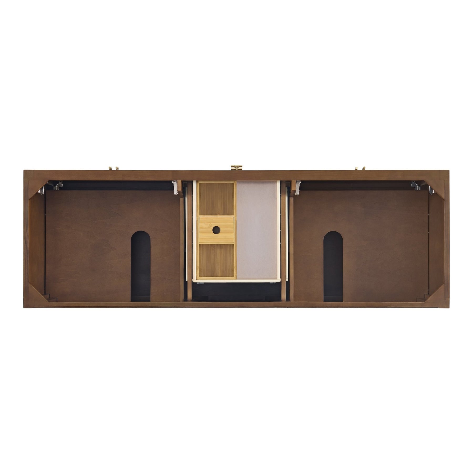 Featuring fluted detailing and a sleek silhouette, the Myrrin 72” Double Vanity brings Mid-Century charm and modern utility to your bathroom. Finished in a rich Mid-Century Walnut and complemented by Champagne Brass T-shaped knobs, Myrrin offers generous storage. The two double-door cabinets each open to reveal a spacious interior with a single shelf and a convenient USB/120V power unit for everyday convenience, with three full-extension drawers (one double-deep) lending additional storage. The finish and hardware accents are enhanced by the Eternal Jasmine Pearl Silestone® top with dual undermount sinks.