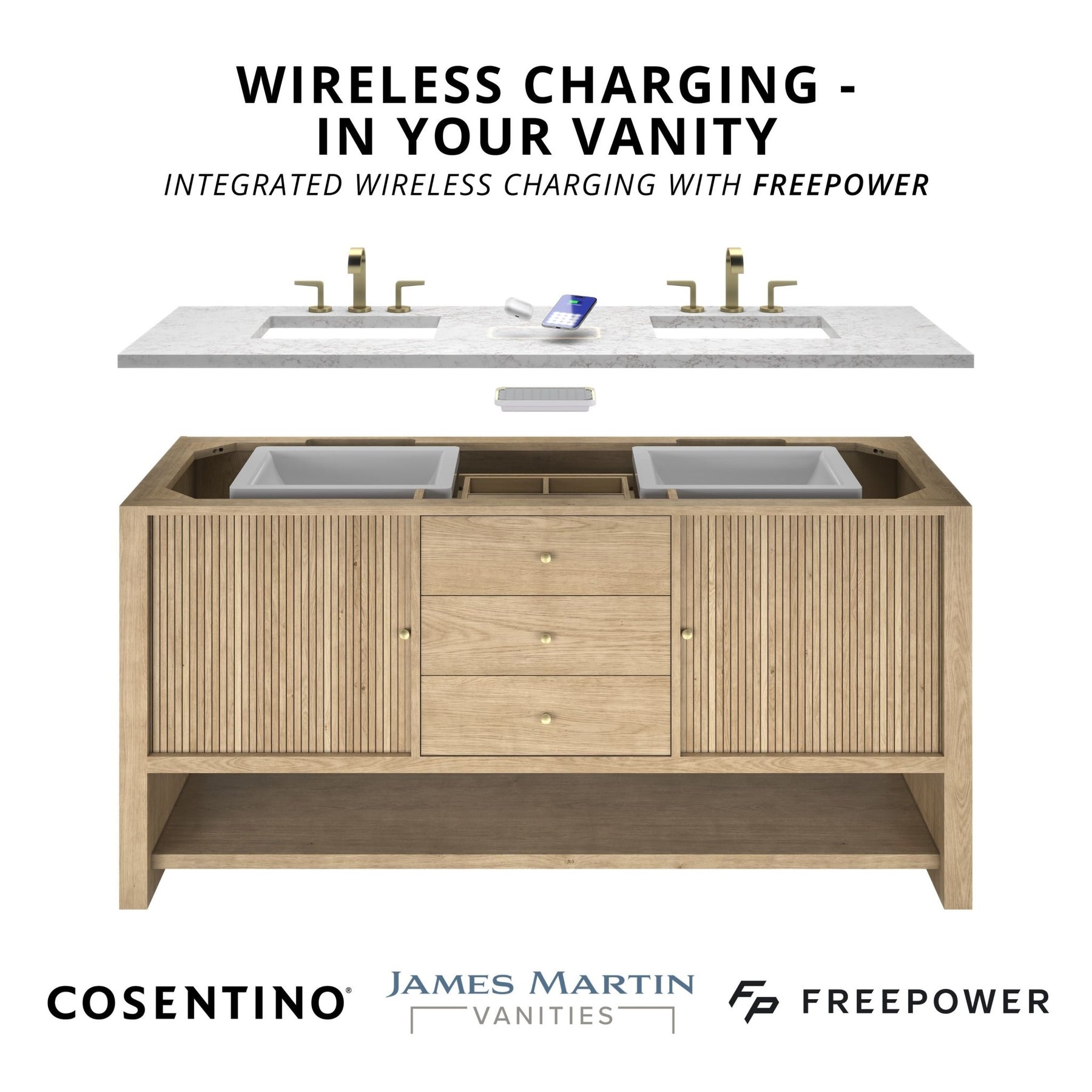 This unit is enabled with FreePower wireless charging; featuring a two-device charger seamlessly embedded into the countertop, indicated by a light-up halo in between the sinks. Designed for modern living, FreePower offers convenient, integrated, wireless charging when and where you need it.