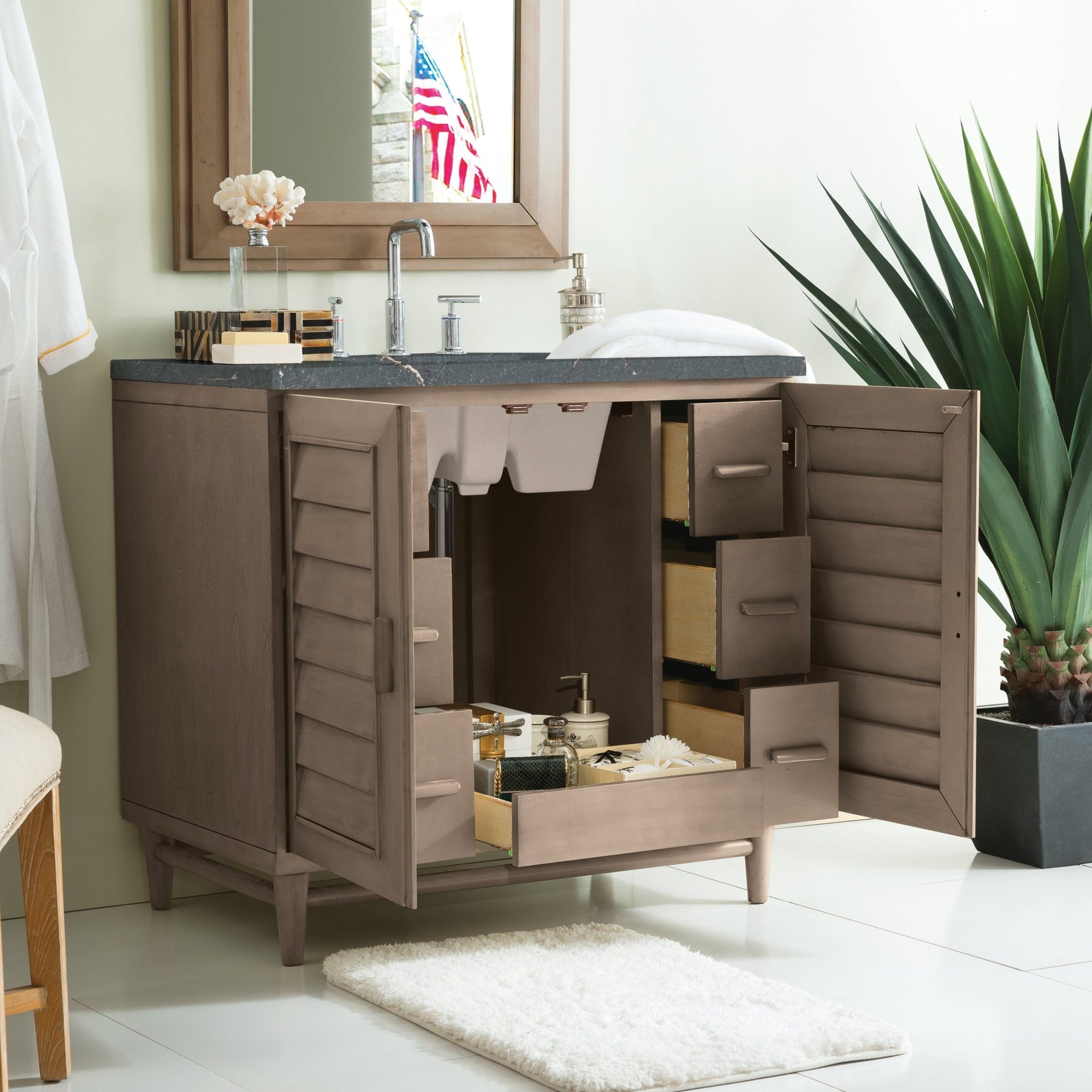 The Portland 36" Whitewashed Walnut Single Vanity features soft-close hinges on doors, with undermount soft-close slides on drawers and concealed ample storage. A proportionate and complementary design with wood knobs and brushed aluminum interior drawers. Completing the look is a Parisien Bleu Silestone top, offering a deep bluish hue with broad and intricate neutral veins highlighted by fine coppery accents which perfectly complement the Whitewashed Walnut finish.
