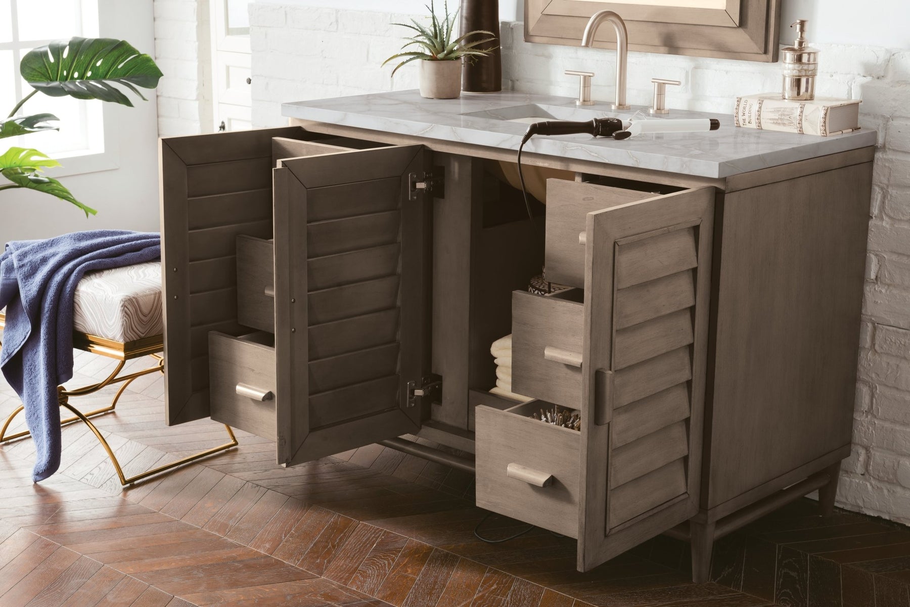The Portland 48" Single Vanity by James Martin Vanities embodies timeless simplicity with an air of coastal California cool. Featuring a relaxed Whitewashed Walnut finish, the Portland is a storage powerhouse. The three shutter-style doors open to reveal seven interior drawers, a removable bamboo drawer organizer, and a conveniently integrated USB/120V power outlet. Completed with a stunning Victorian Silver Silestone® top with undermount sink, Portland is a sophisticated and versatile vanity solution for your bathroom.