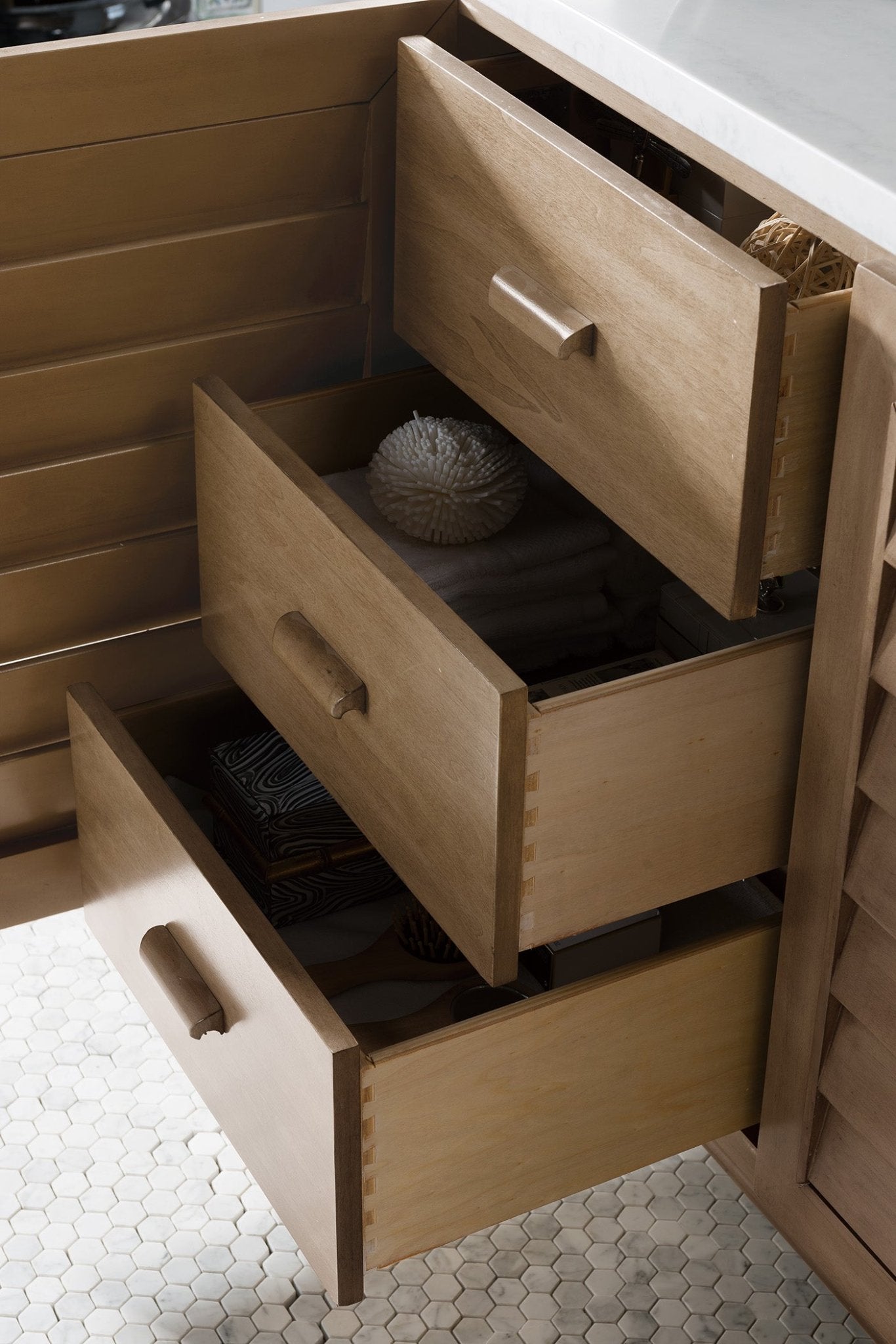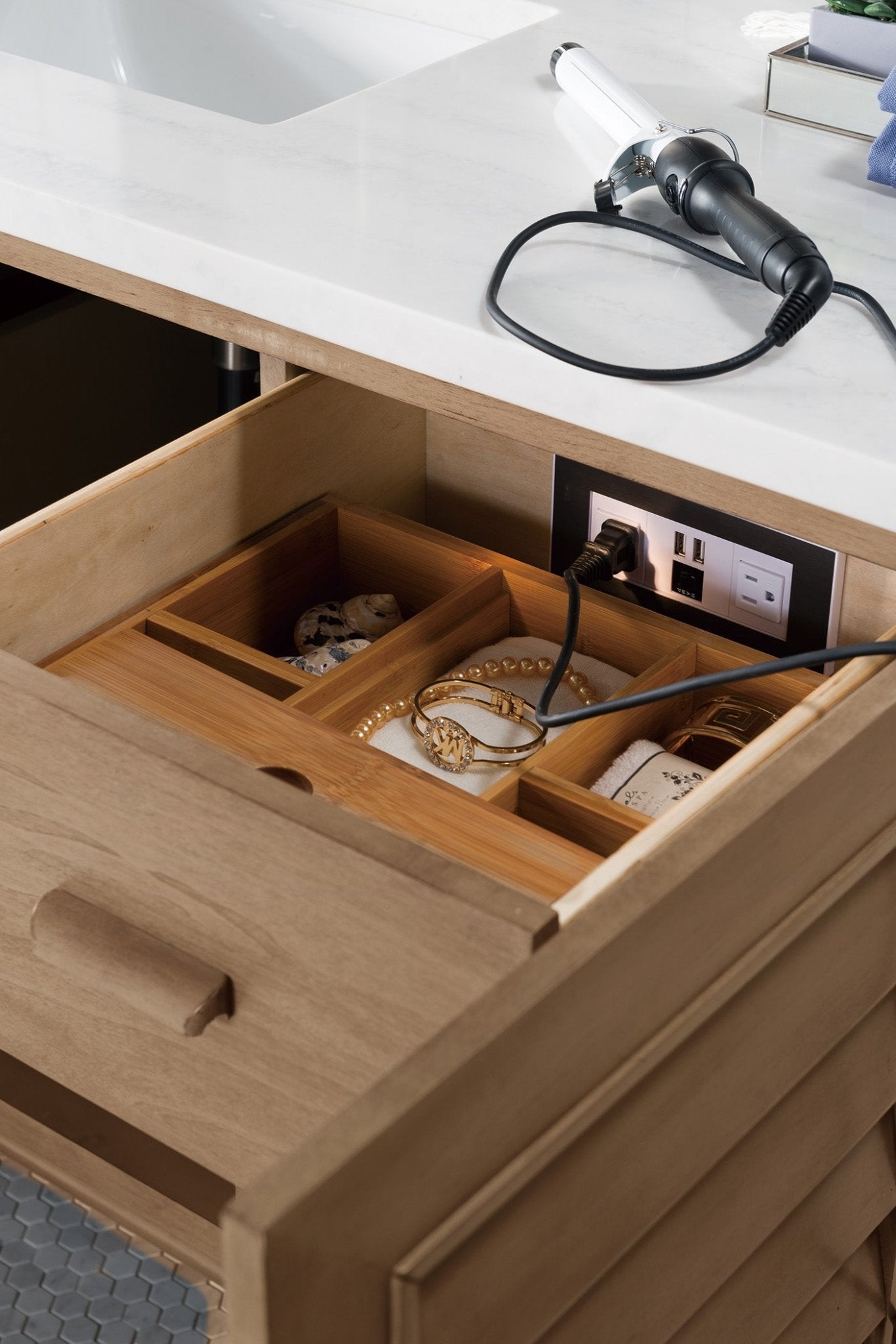 The Portland 60" Whitewashed Walnut Single Vanity features soft-close hinges on doors, with undermount soft-close slides on drawers and concealed ample storage. A proportionate and complementary design with wood knobs and brushed aluminum interior drawers. Premium features include one bamboo drawer organizer and one electrical component with two USB outlets. The look is completed with a 3 CM eased edge Arctic Fall Solid Surface top and one white ceramic rectangular sink.