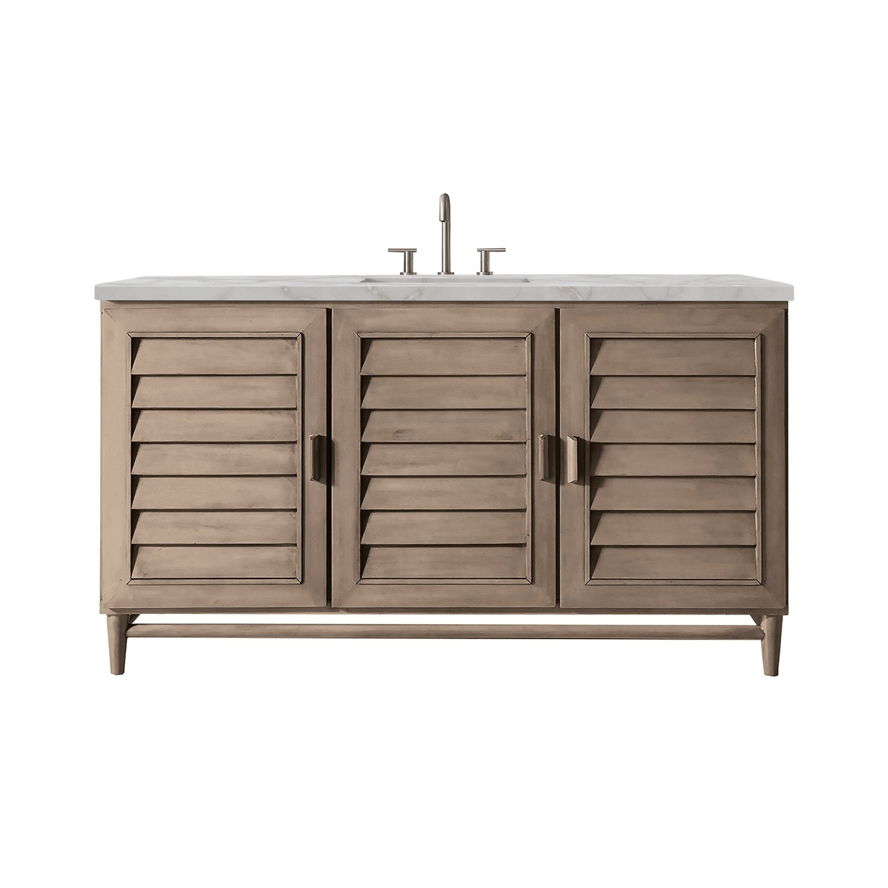 The Portland 60" Single Vanity by James Martin Vanities embodies timeless simplicity with an air of coastal California cool. Featuring a relaxed Whitewashed Walnut finish, the Portland is a storage powerhouse. The three shutter-style doors open to reveal seven interior drawers, a removable bamboo drawer organizer, and a conveniently integrated USB/120V power outlet. Completed with a stunning Victorian Silver Silestone® top with undermount sink, Portland is a sophisticated and versatile vanity solution for your bathroom.