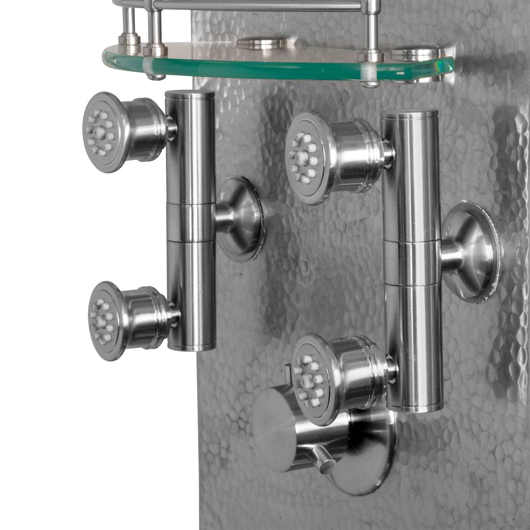 The Southwest inspired Vaquero ShowerSpa is the oasis of the bath! The hand-forged hammered brushed aluminum panel with nickel plating and brass fixtures in Brushed Nickel finish are a stunning combination. Featuring 4 dual-head body jets, a rain showerhead and multi-function handshower. Old world craftsmanship united with modern day performance.