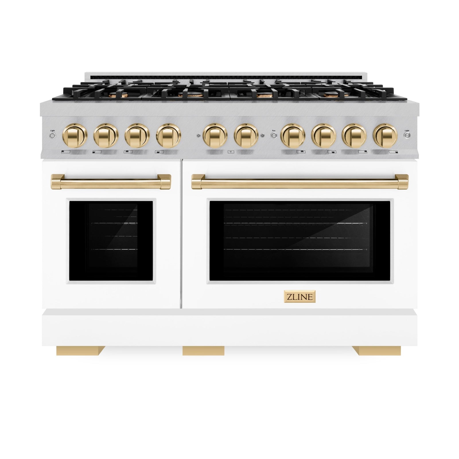 ZLINE Autograph Edition 48 in. 6.7 cu. ft. Select Double Oven Gas Range with 8 Burner Cooktop in Stainless Steel with White Matte Doors and Polished Gold Accents (HGRZ-WM-48-G)
