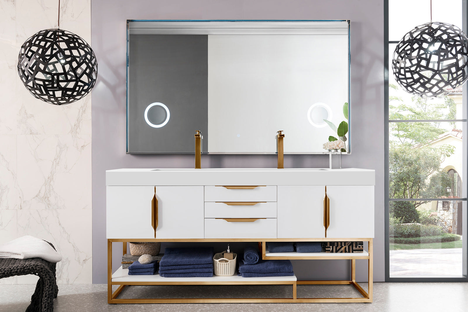 Columbia 59" Double Wall Mount Vanity, Glossy White, Radiant Gold w/ Glossy White Composite Stone Top