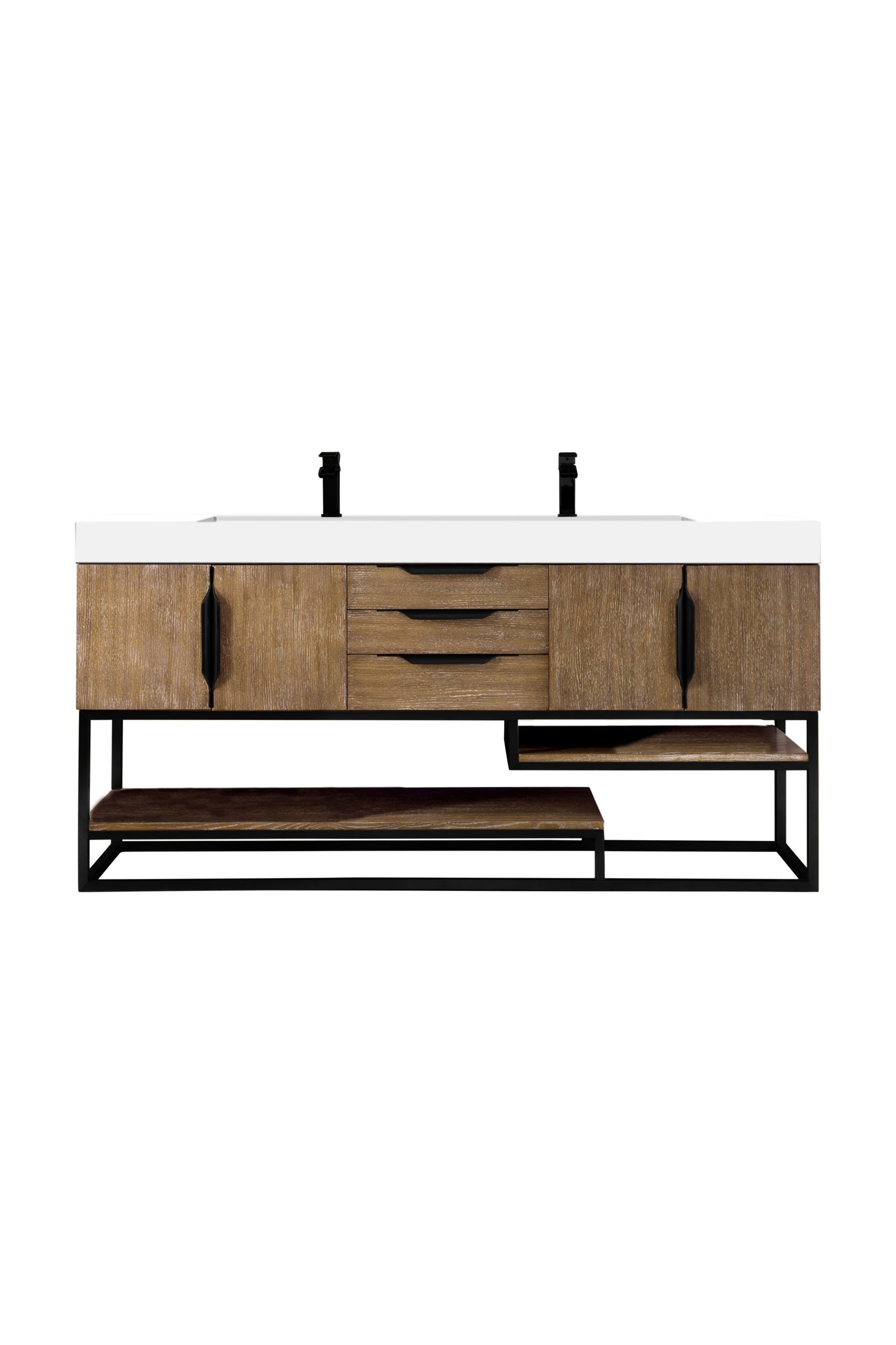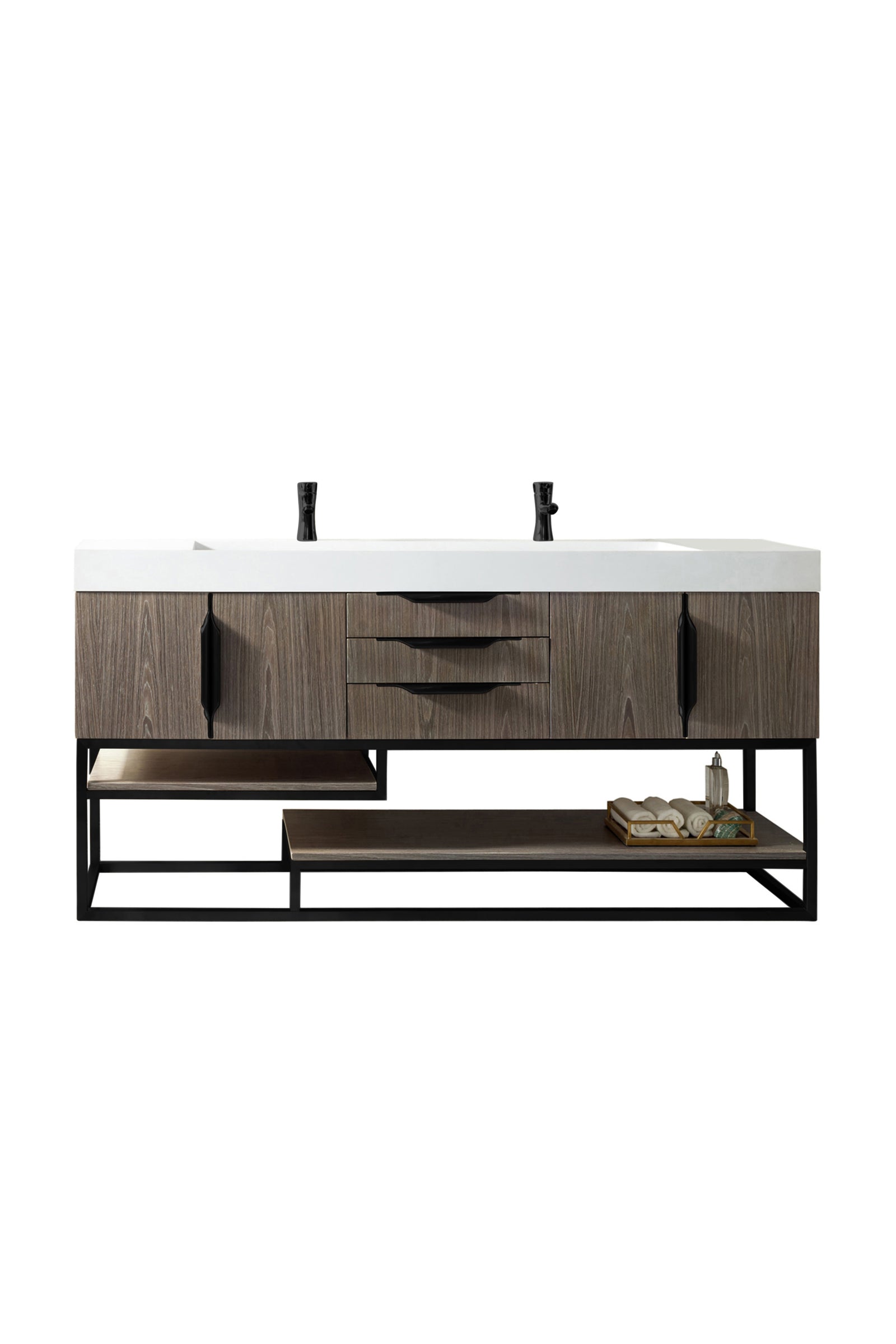Columbia 59" Double Wall Mount Vanity, Latte Oak, Matte Black w/ Glossy White Composite Stone Top