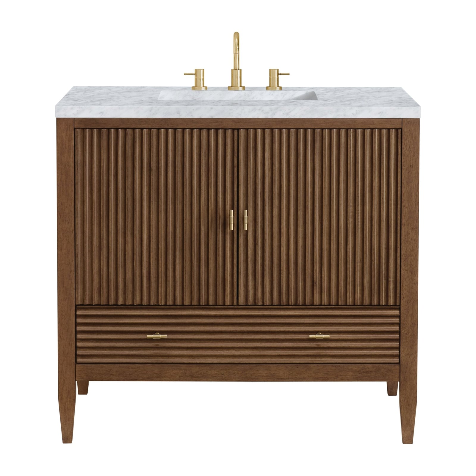 Myrrin 36" Vanity, Mid Century Walnut w/ 3 CM Carrara White Marble Top
