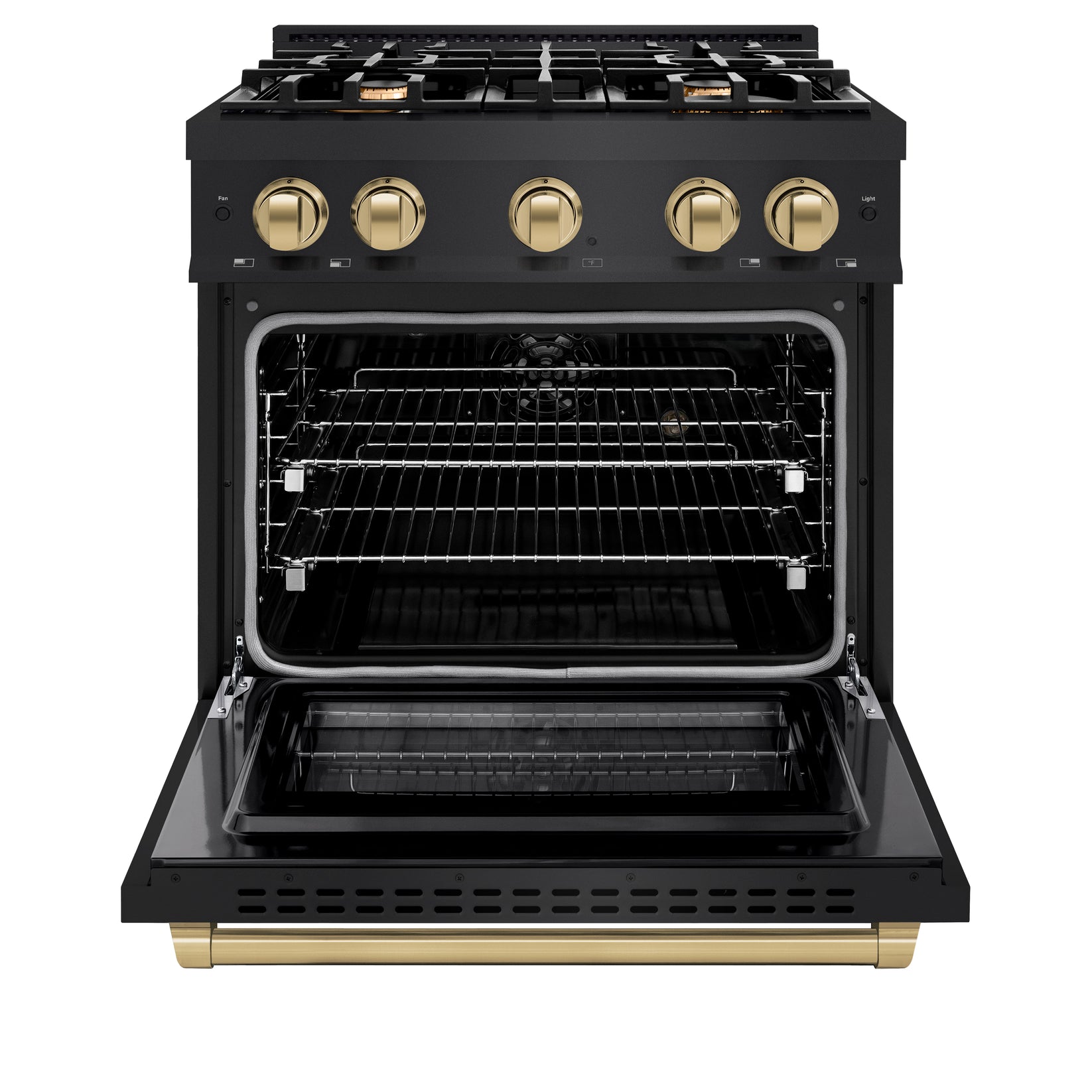 The ZLINE Autograph Edition 30" 4.2 cu. ft. Select Dual Fuel Range with 4 Burner Gas Cooktop and Electric Convection Oven in Black Stainless Steel with Champagne Bronze Accents (HDRBZ-30-CB) combines the elegance of a hand-finished porcelain gas cooktop with 4 Italian-made auto-reignition burners, an electric convection oven with an energy-efficient cooling fan to ensure quiet operation, a Horizon oven door window design, and stunning champagne bronze knobs and handle allowing you to master every meal. With a modern, timeless style and refined functionality, ZLINE Select Dual Fuel Ranges are masterfully crafted to deliver an elevated culinary experience.