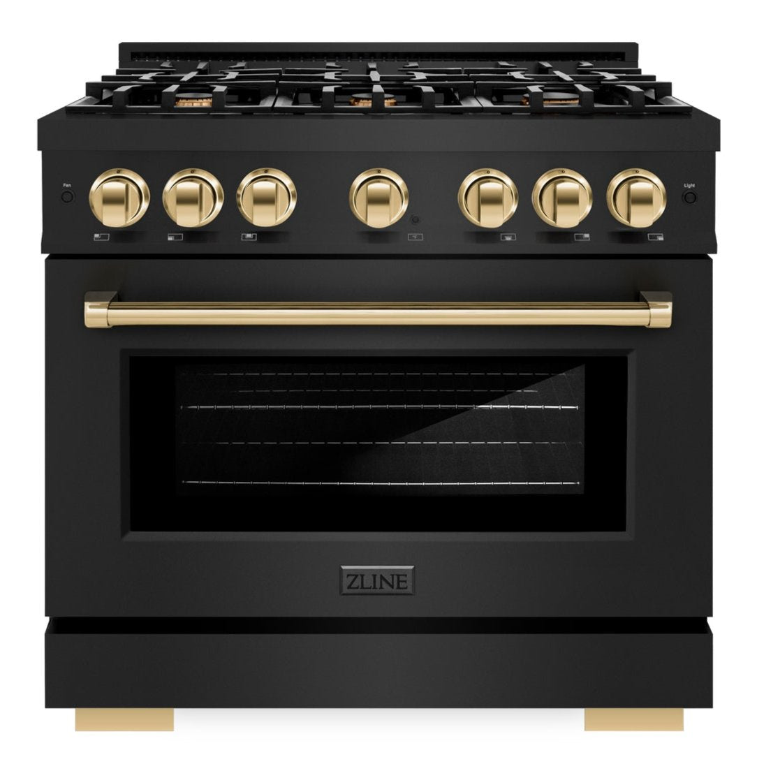 The ZLINE Autograph Edition 36" 5.2 cu. ft. Select Dual Fuel Range with 6 Burner Gas Cooktop and Electric Convection Oven in Black Stainless Steel with Polished Gold Accents (HDRBZ-36-G) combines the elegance of a hand-finished porcelain gas cooktop with 6 Italian-made auto-reignition burners, an electric convection oven with an energy-efficient cooling fan to ensure quiet operation, a Horizon oven door window design, and stunning polished gold knobs and handle allowing you to master every meal. With a modern, timeless style and refined functionality, ZLINE Select Dual Fuel Ranges are masterfully crafted to deliver an elevated culinary experience.